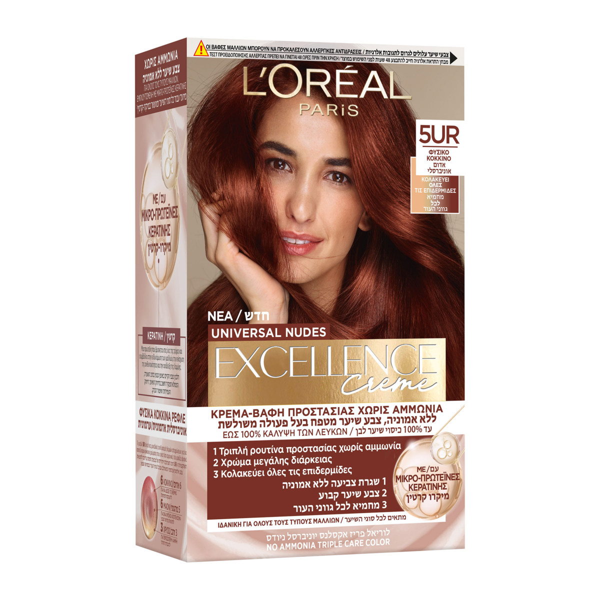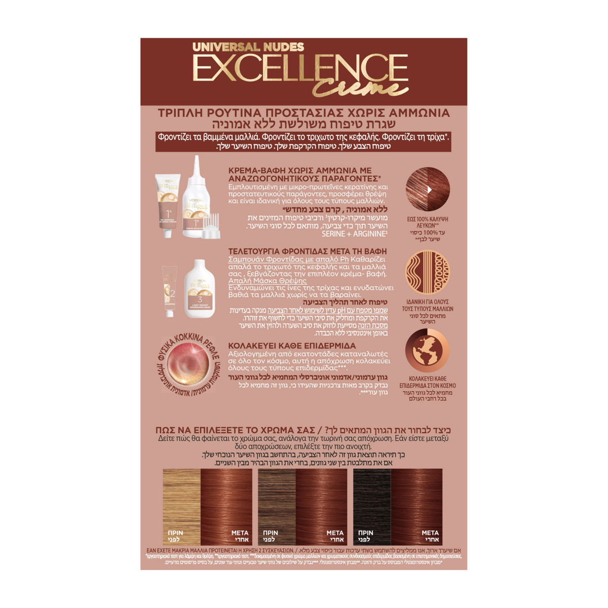 Η βαφή μαλλιών Excellence Universal Nudes από την L'Oreal Paris προσφέρει την πλούσια ένταση και ζωντάνια του μόνιμου χρώματος μαλλιών, χωρίς αμμωνία. Περιλαμβάνει σύμπλεγμα Pro-Keratin και παράγοντες περιποίησης για την προστασία των μαλλιών καθώς βάφονται. Αυτή η βαφή: - Προσφέρει 100% κάλυψη των λευκών, χωρίς αμμωνία - Είναι εμπλουτισμένη με Σύμπλεγμα Pro-Keratin - Προσφέρει πλούσιο, λαμπερό και φυσικό χρώμα - Δίνει αίσθηση απαλότητας στα μαλλιά και στο τριχωτό - Δεν περιέχει parabens, φθαλικές ενώσεις και ορυκτά έλαια.