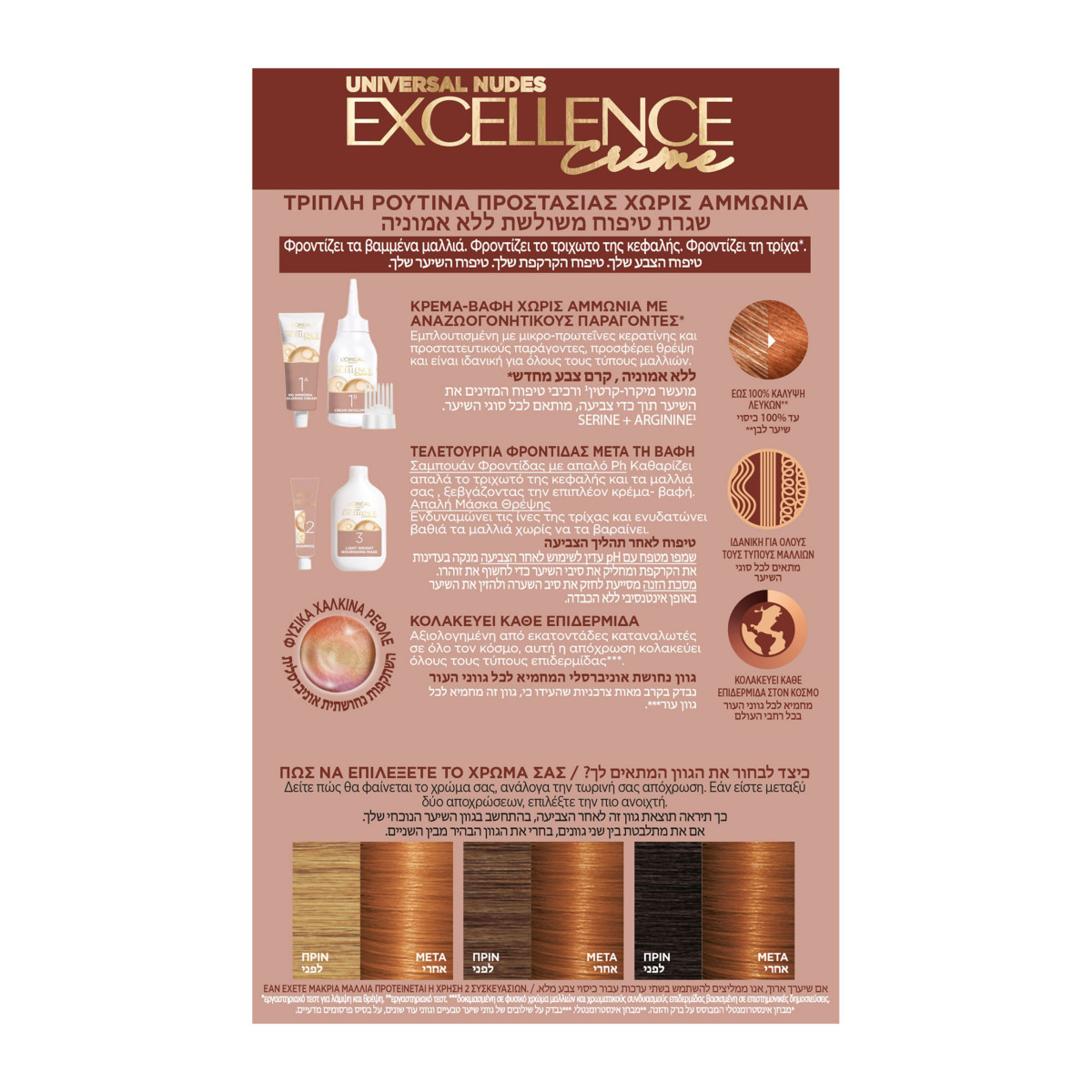 Excellence Universal Nudes hair dye by L'Oreal Paris offers the rich intensity and vibrancy of permanent hair color, without ammonia. It includes Pro-Keratin complex and conditioning agents to protect hair as it is coloured. This colour: - Offers 100% coverage of white hair, without ammonia; - Is enriched with Pro-Keratin Complex; - Provides rich, shiny and natural colour; - Gives a feeling of softness to the hair and scalp; - Contains no parabens, phthalates or mineral oils; - Is ideal for all hair types and textures