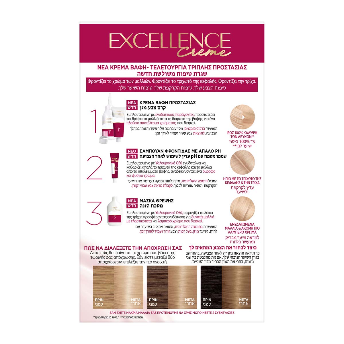 Excellence is evolving with a new, improved formulation, enriched with Hyaluronic Acid. A triple-drip protection routine for even richer colour and 10X more hydration. Formula enriched with Prokeratin, restructures and revitalizes hair and nourishes it, leaving it silky and soft. Gives spectacular color without a single white hair!