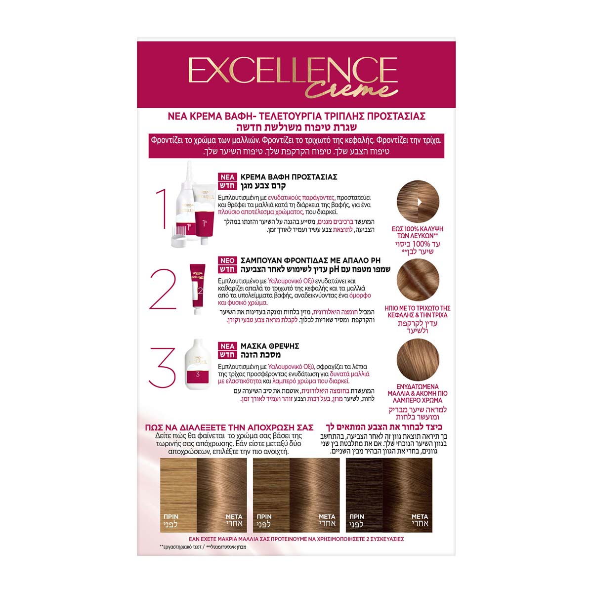Excellence is evolving with a new, improved formulation, enriched with Hyaluronic Acid. A triple-drip protection routine for even richer colour and 10X more hydration. Formula enriched with Prokeratin, restructures and revitalizes hair and nourishes it, leaving it silky and soft. Gives spectacular color without a single white hair!