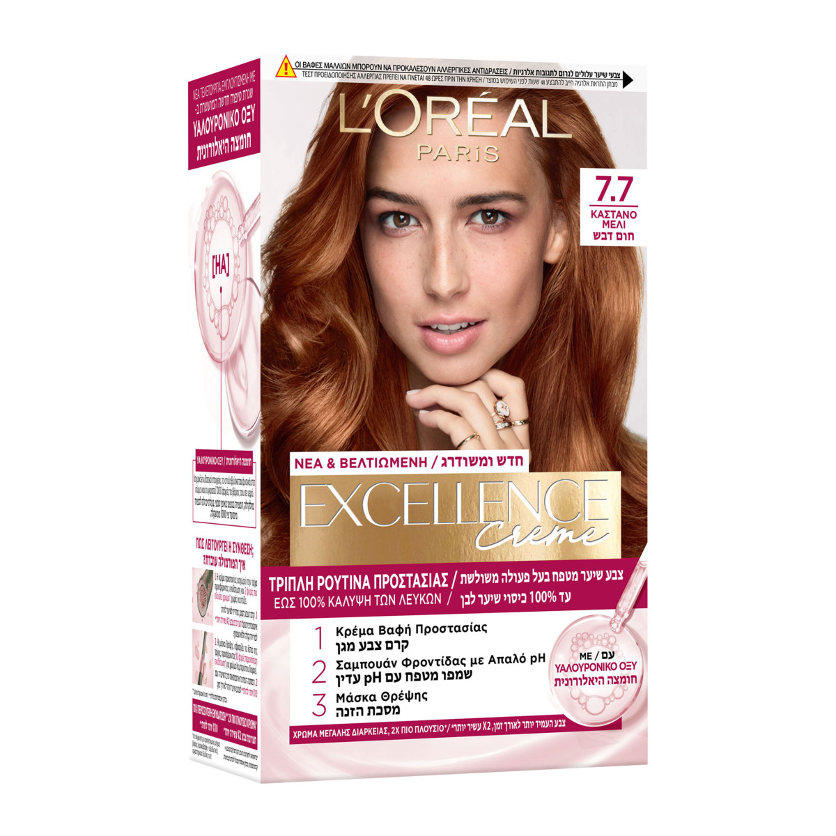 H Excellence εξελίσσεται με μία νέα, βελτιωμένη σύνθεση, εμπλουτισμένη με Υαλουρονικό οξύ. Τριπλή ρουτίνα προστασίας που δεν στάζει για ακόμα πιο πλούσιο χρώμα και 10Χ περισσότερη ενυδάτωση. Φόρμουλα εμπλουτισμένη με Προκερατίνη, αναδομεί και αναζωογονεί τα μαλλιά και τα θρέφει, αφήνοντάς τα μεταξένια και απαλά. Χαρίζει εντυπωσιακό χρώμα, χωρίς ούτε μια λευκή τρίχα!