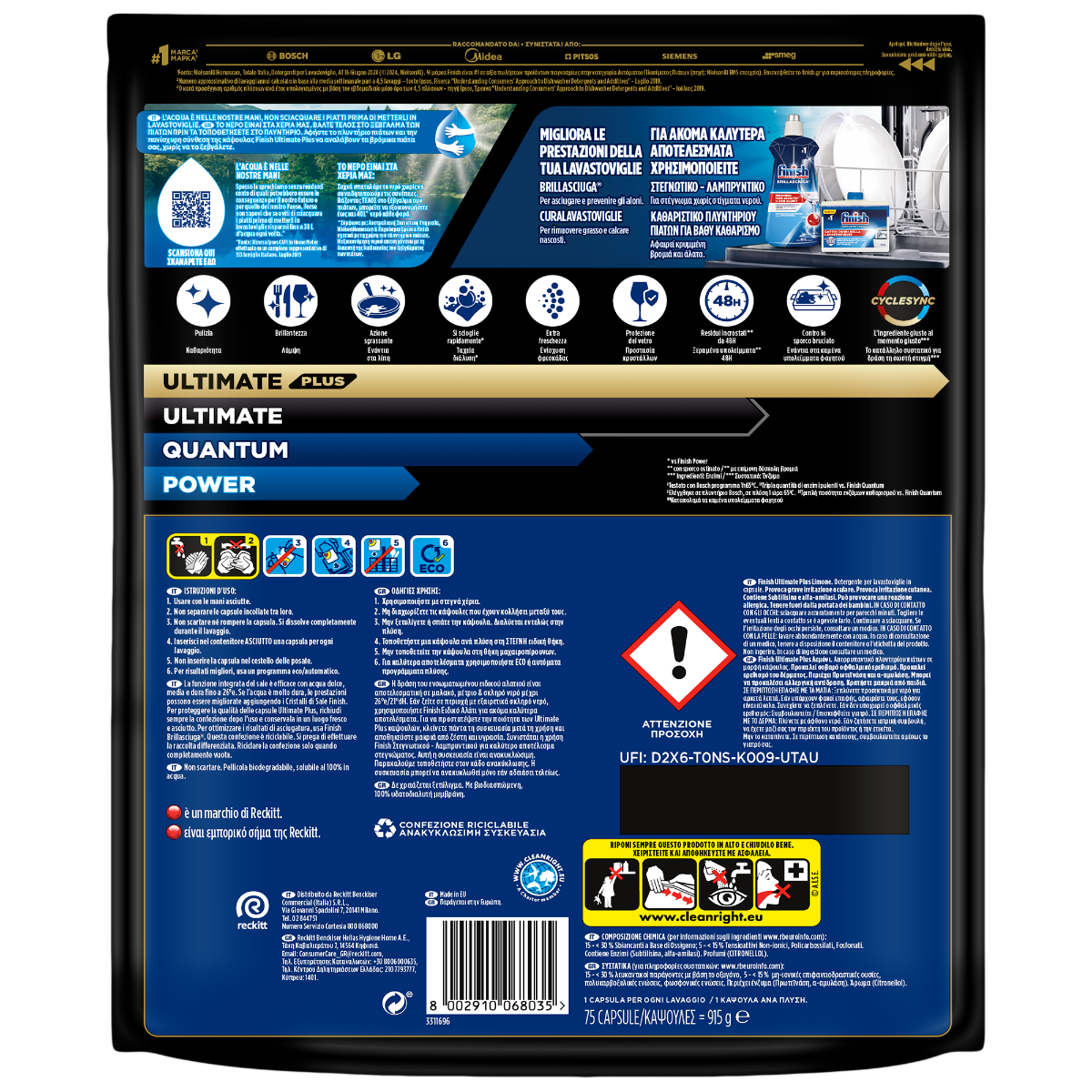 Finish Ultimate Plus Λεμόνι. Απορρυπαντικό πλυντηρίου πιάτων σε μορφή κάψουλας. Για απόλυτη καθαριότητα και διαμαντένια λάμψη από την 1η φορά και κάθε φορά. Είναι η πρώτη μας κάψουλα με τεχνολογία CYCLESYNC™, η οποία απελευθερώνει το κατάλληλο συστατικό* για δράση τη σωστή στιγμή του κύκλου πλύσης. Η προηγμένη σύνθεσή της είναι αποτελεσματική στην αφαίρεση ακόμα και καμένων υπολειμμάτων φαγητού χωρίς ξέβγαλμα, προσφέροντας 4 δράσεις κατά τη διάρκεια του κύκλου πλύσης. Οι κάψουλες προστατεύουν και φροντίζουν τα γυάλινα σκεύη και τα μαχαιροπίρουνά σας, διατηρώντας τη λάμψη τους σε κάθε πλύση.*Συστατικό: Ένζυμο.