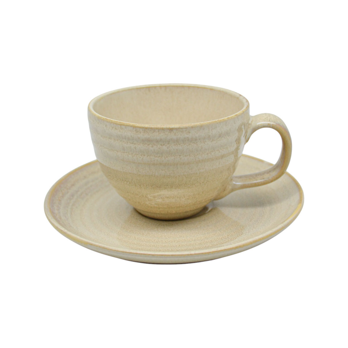 Σετ 6 φλυτζανιών καφέ με πιατάκι, κεραμικά, σε ζεστή μπεζ απόχρωση. Το ελαφρώς κυματιστό σχέδιο στην επιφάνεια χαρίζει φυσική, χειροποίητη αισθητική και διακριτική κομψότητα. Ιδανικά για καφέ ή άλλα ροφήματα, συνδυάζουν στυλ και πρακτικότητα.