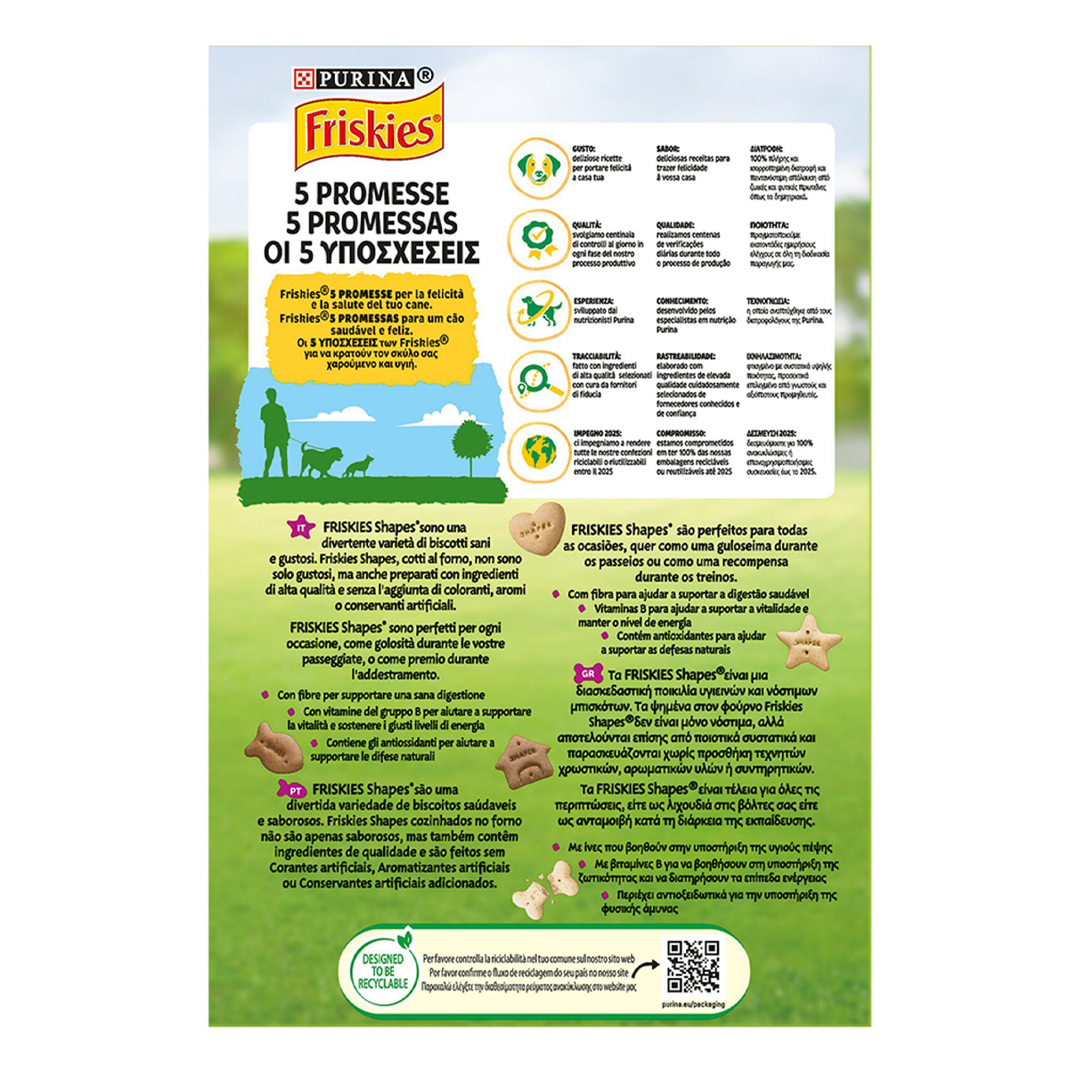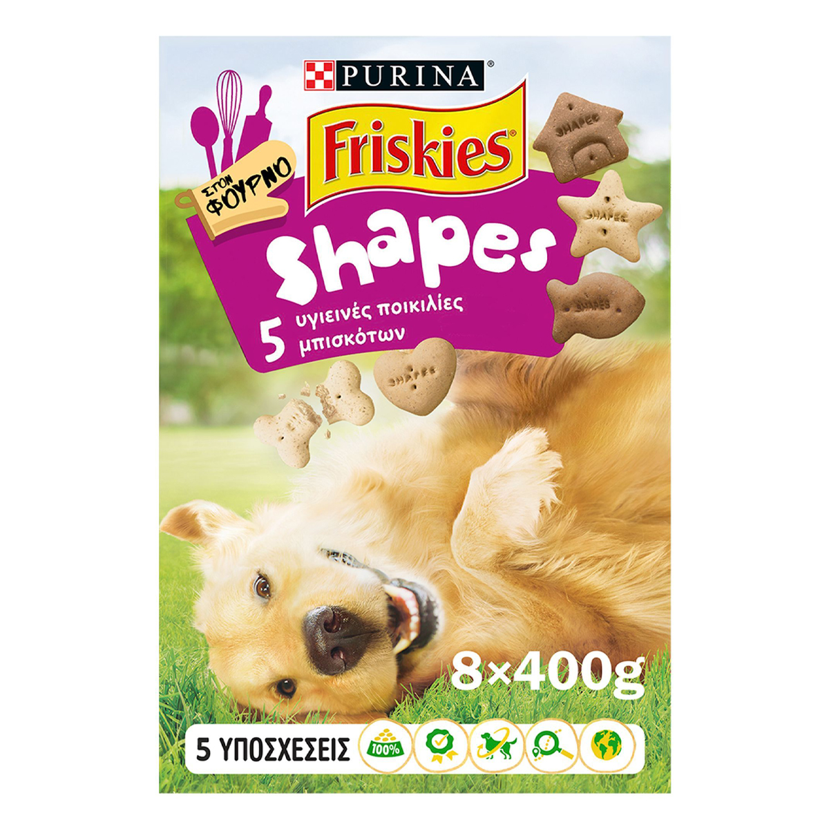 FRISKIES Shapes can be offered at any time of the day as a treat, as a reward or as a tasty addition to your dog's main meal. With fibre to help support healthy digestion. With Omega 3 & 6 fatty acids to help maintain healthy skin and a shiny coat. Contain antioxidants that help support natural defenses. With iron that helps support natural vitality. With calcium and vitamin D for strong teeth and bones.