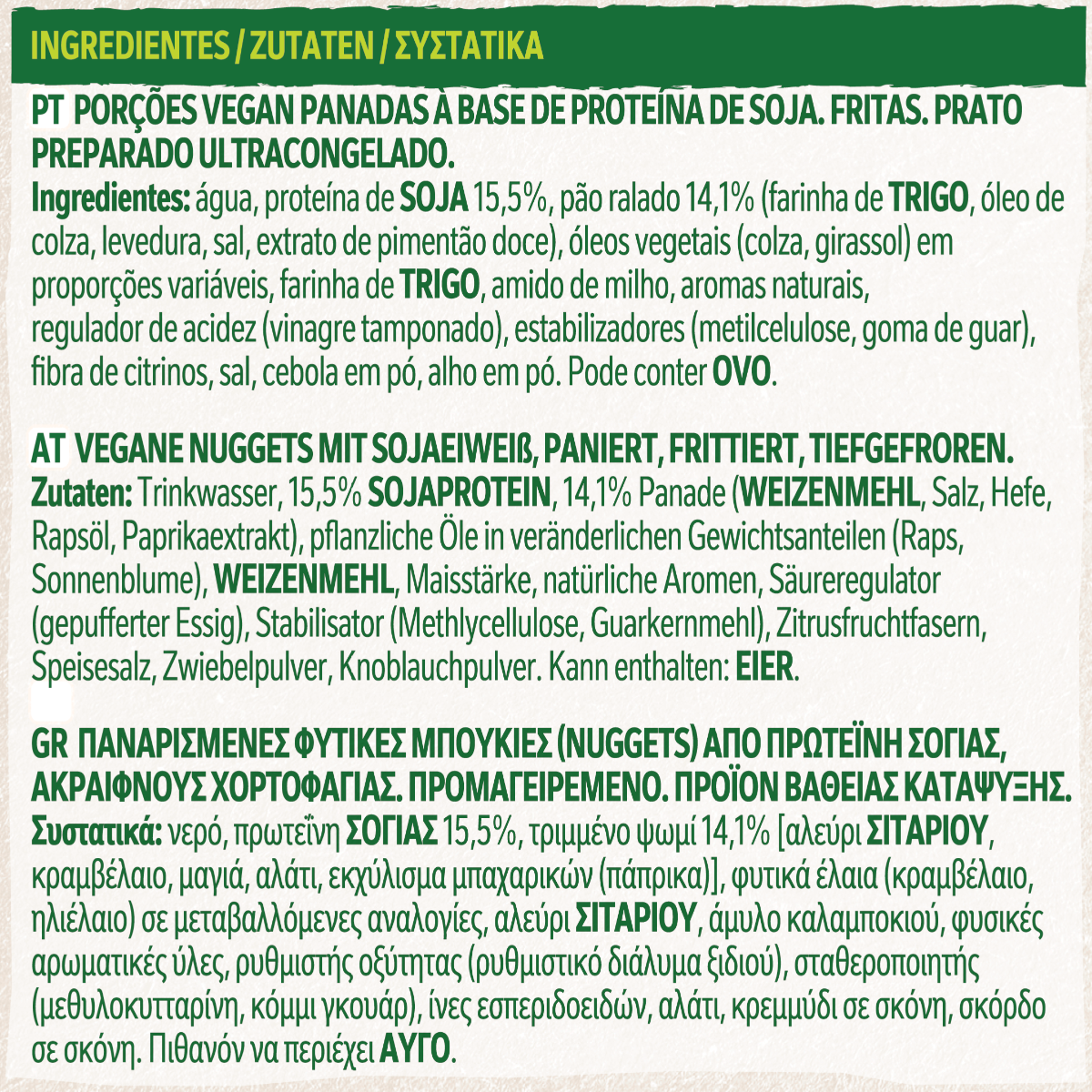 Breaded vegetable nuggets made from WINE protein, vegan. GARDEN GOURMET Vegan Nuggets. Vegan Nuggets have the well-known taste of nuggets without meat! They are so delicious and crunchy that they are the perfect snack for kids and adults alike.