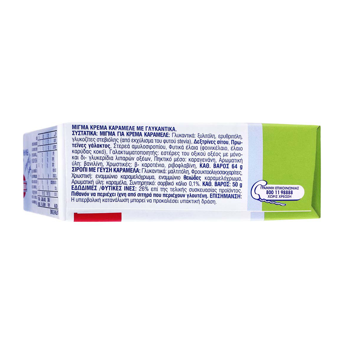 Mix for Caramel Cream: sweeteners: xylitol, erythritol, steviol glycosides (from stevia plant extract), wheat dextrins, MILK proteins, starch solids, vegetable oils (palm oil, coconut coconut oil), emulsifiers (acetic acid esters with mono- and diglycerides of fatty acids), thickening agent: carrageenan, flavouring: vanillin, colouring: beta-carotene, riboflavin.