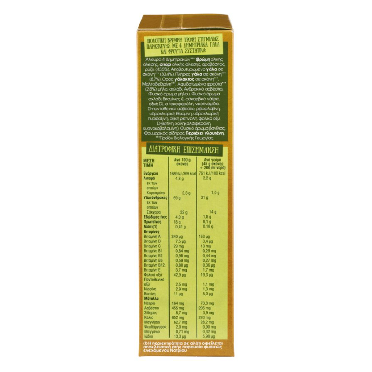 4 Cereal Flour* (wholemeal BREAD, wholemeal CEREAL, wholemeal CEREAL, maize, rice) (43,5%), skimmed MILK powder* (30,4%), whole MILK powder* (8,7%), MILK serum powder*, maltodextrin*, dehydrated fruit* (2,8%): apple, pear, calcium carbonate, natural apple flavor, natural pear flavor, Vitamins (L-sodium ascorbate, DL-α-tocopherol acetate, nicotinamide, calcium D-pantothenate, riboflavin, thiamine hydrochloride, pyridoxine hydrochloride, retinol acetate, folic acid, D-biotin, cholecalciferol, cyanocobalamin), natural vanilla flavour, iron fumarate.