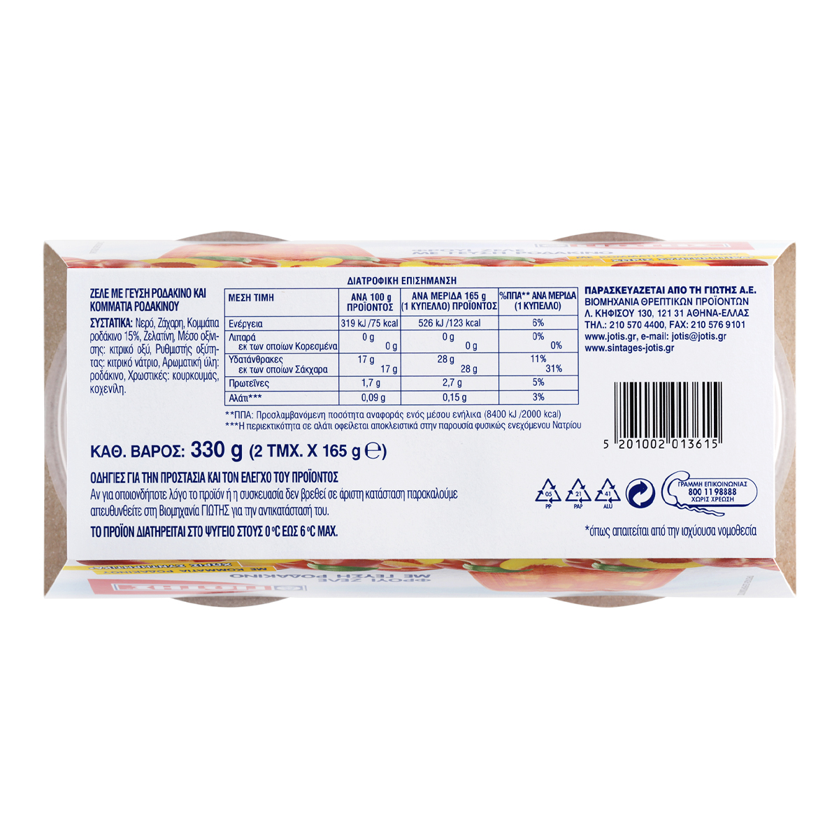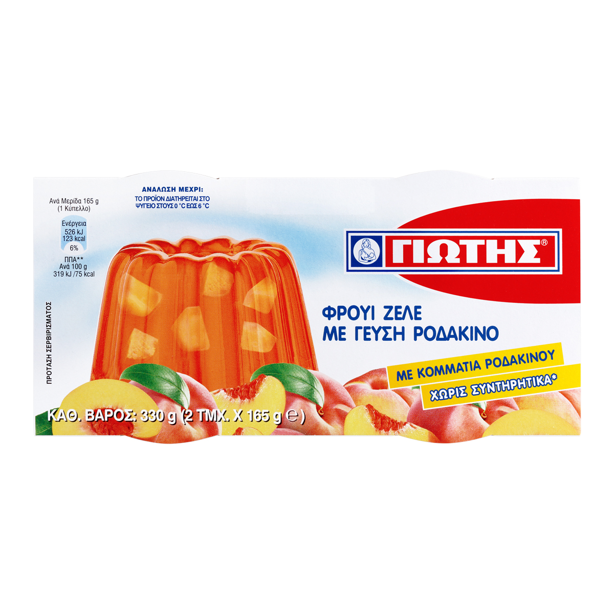 Water sugar, peach pieces 15%, gelatine, acidifier: citric acid, acidity regulator: sodium citrate, flavouring: peach, colouring: turmeric, cochineal.