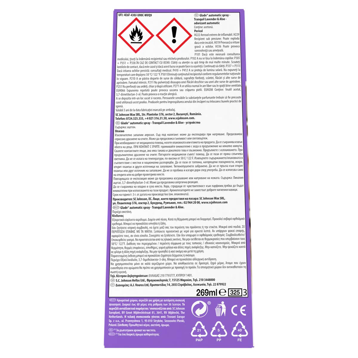 Το Glade® Automatic Spray προσφέρει υπέροχο άρωμα τη μια εβδομάδα μετά την άλλη, αυτόματα. Με 2 τρόπους ψεκασμού: 1. Ρύθμιση χρονοδιακόπτη 2. Κουμπί extra ψεκασμού. CALM LAVENDER & JASMINE : Χαλαρώστε και αφεθείτε στις νότες της κρεμώδους βανίλιας που συναντούν αρμονικά το χαλαρωτικό άρωμα των ανθών λεβάντας και του ζεστού κεχριμπαριού, χαρίζοντας έτσι μια ήρεμη συμφωνία γλυκιάς απλότητας. Αρωμα εμπλουτισμένο με αιθέρια έλαια. 1 ΣΥΣΚΕΥΗ ΑΥΤΟΜΑΤΟΥ ΨΕΚΑΣΜΟΥ GLADE, 2 ΜΠΑΤΑΡΙΕΣ AA, 1 ΑΝΤΑΛΛΑΚΤΙΚΟ GLADE AUTOMATIC SPRAY.