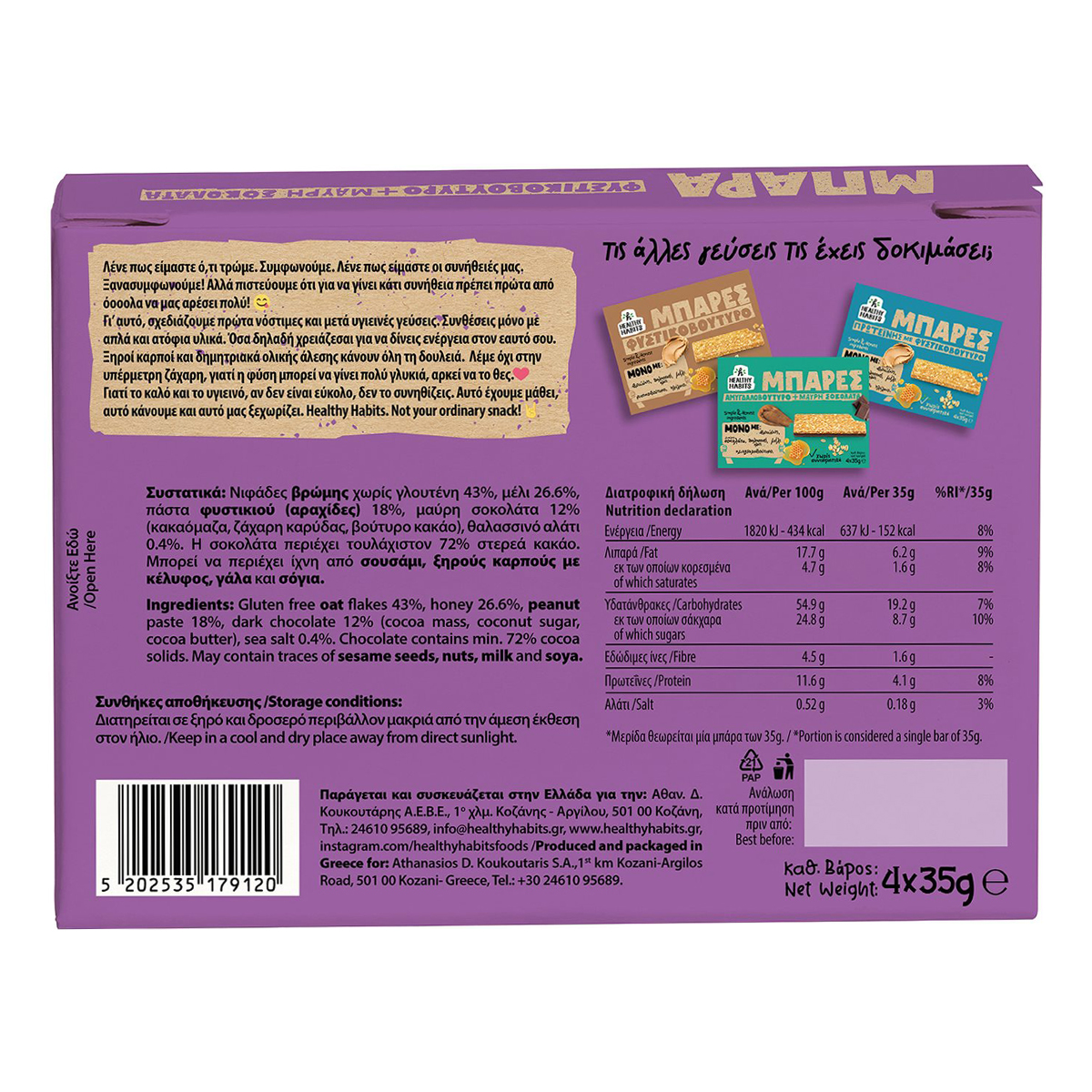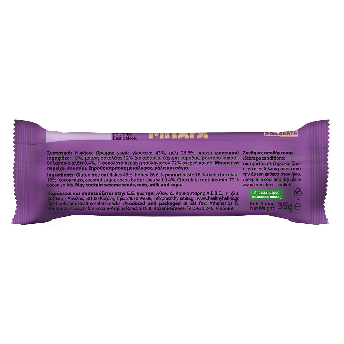 Bars with oat flakes, sea salt, honey & dark chocolate. No preservatives.