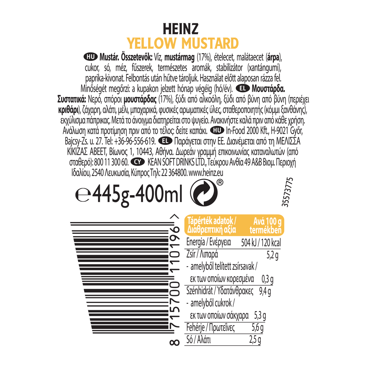 Water, MUSTARD seeds (17%), alcohol vinegar, malt vinegar (contains CRITTER), sugar, salt, honey, spices, natural flavourings, stabilizer (xanthan gum), paprika extract.