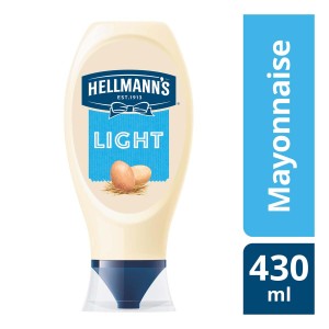 Hellmann's Light 430 ml contains less than half the calories and fat of real Mayonnaise and only 41 calories per spoonful. But you'll never know until you try it. For those who watch their line but don't want to miss out on their favorite habits, now in an innovative Hellmann's bottle where every drop stays as delicious as the first! The unique CLEAN BOTTLE is designed to keep the rich taste of our Hellmann's unchanged.
