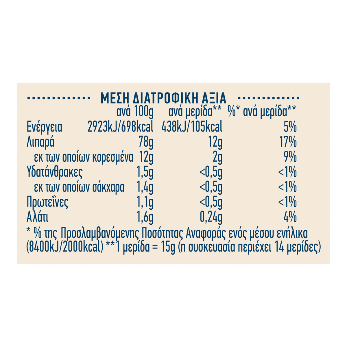 * DISCLAIMER: Chalkiadakis SA, always respecting its consumers, strives to provide reliable information on its website, based on the data it receives from its suppliers. However, Chalkiadakis SA informs that there may be discrepancies between the information provided and that on product labels, for technical reasons that may be due to stock updates. The information presented on the website does not in any way replace the information on the product labels, and in case of any discrepancy, the information on the product labels always prevails. Consumers must check the information on the labels before purchasing and before consuming the product and always consume it according to the intended use defined by the supplier. In case of disagreement, the consumer expressly waives any right of appeal against Chalkiadakis SA.