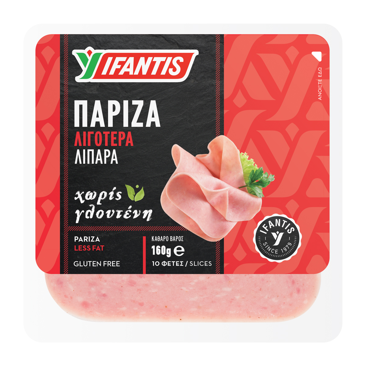 Delicious pariza made from selected pieces of fine pork. Low in fat* and high in protein. Gluten-free. In economical packaging (-0,20€ cheaper) with 10 slices, in square shape, to make delicious toasties for the whole family quickly and easily!Packaged with the innovative FRESHPRESS technology that offers the best possible protection and safety in food production, keeping the taste and nutrients unchanged for a longer period of time after opening the package. With the Ifantis quality guarantee.* 30% less fat than similar products.