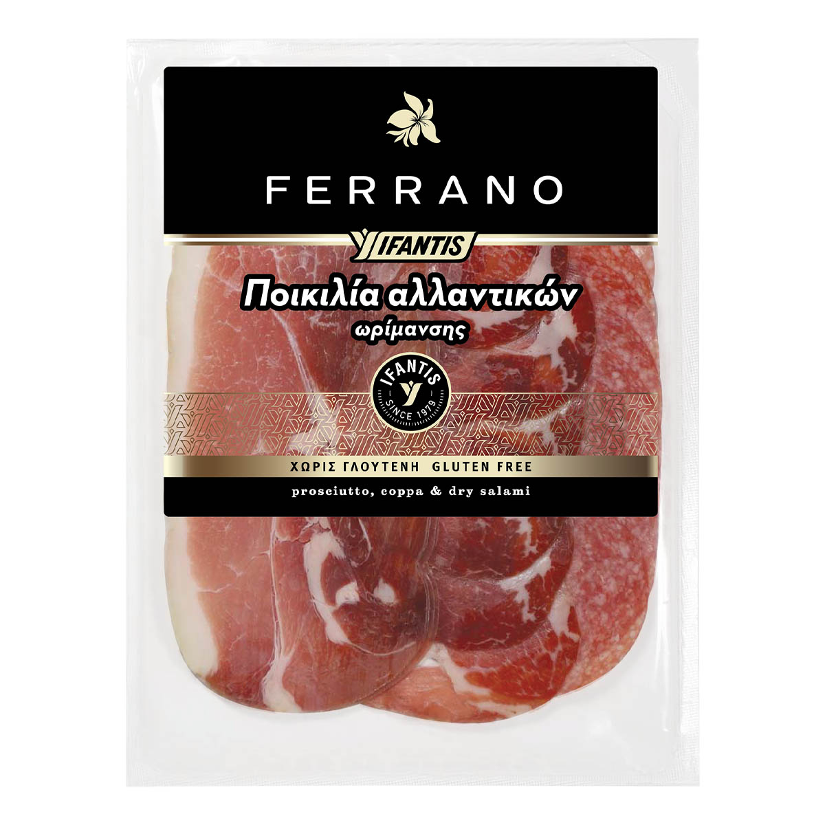 Variety with proscuitto, coppa & dry salami (air salami). Fine pork sausages. They are matured slowly, for a rich taste, in the unique curing chambers that exist in Greece and are made according to the standards and know-how of the world's largest curing houses. Gluten free. With the Ifantis quality guarantee.