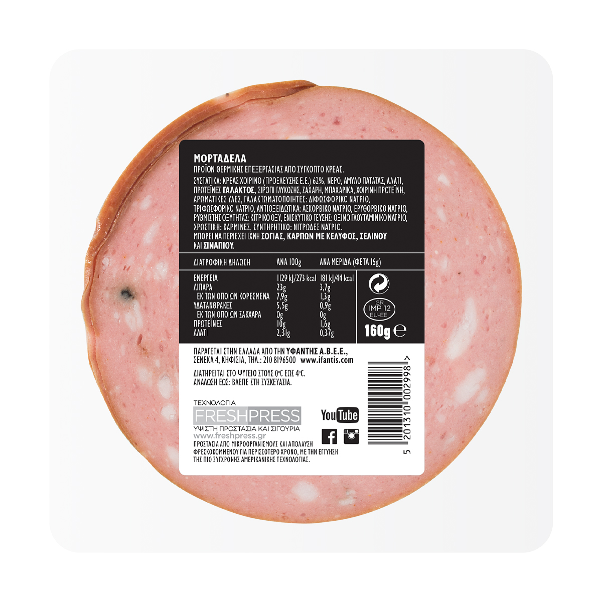 Νόστιμη βραστή μορταδέλα με πλούσια γεύση, από εκλεκτό βραστό χοιρινό κρέας αρωματισμένο με επιλεγμένα καρυκεύματα. Πρακτική συσκευασία 160 γραμμαρίων, με 10 φέτες.
