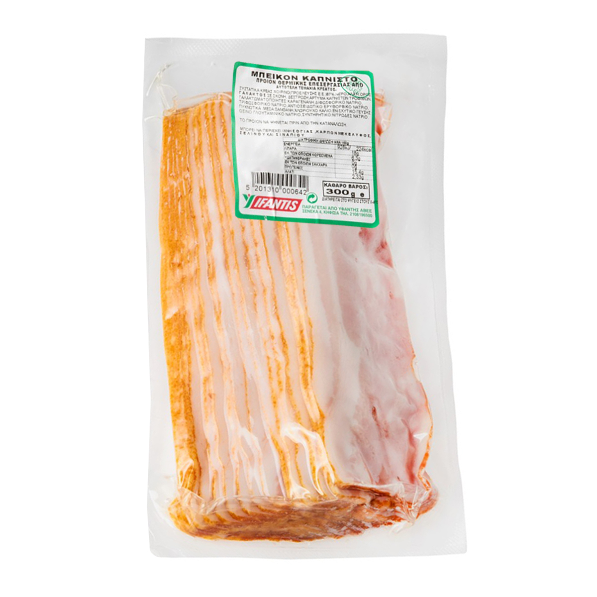 From fine pork. Rich taste, from pieces of fine smoked pork, with high protein content. Gluten-free. Deliciously accompanies every meal of the day: the classic bacon, lettuce, tomato sandwich, fried eggs, but also delicious, original salads. With the Ifantis quality guarantee.