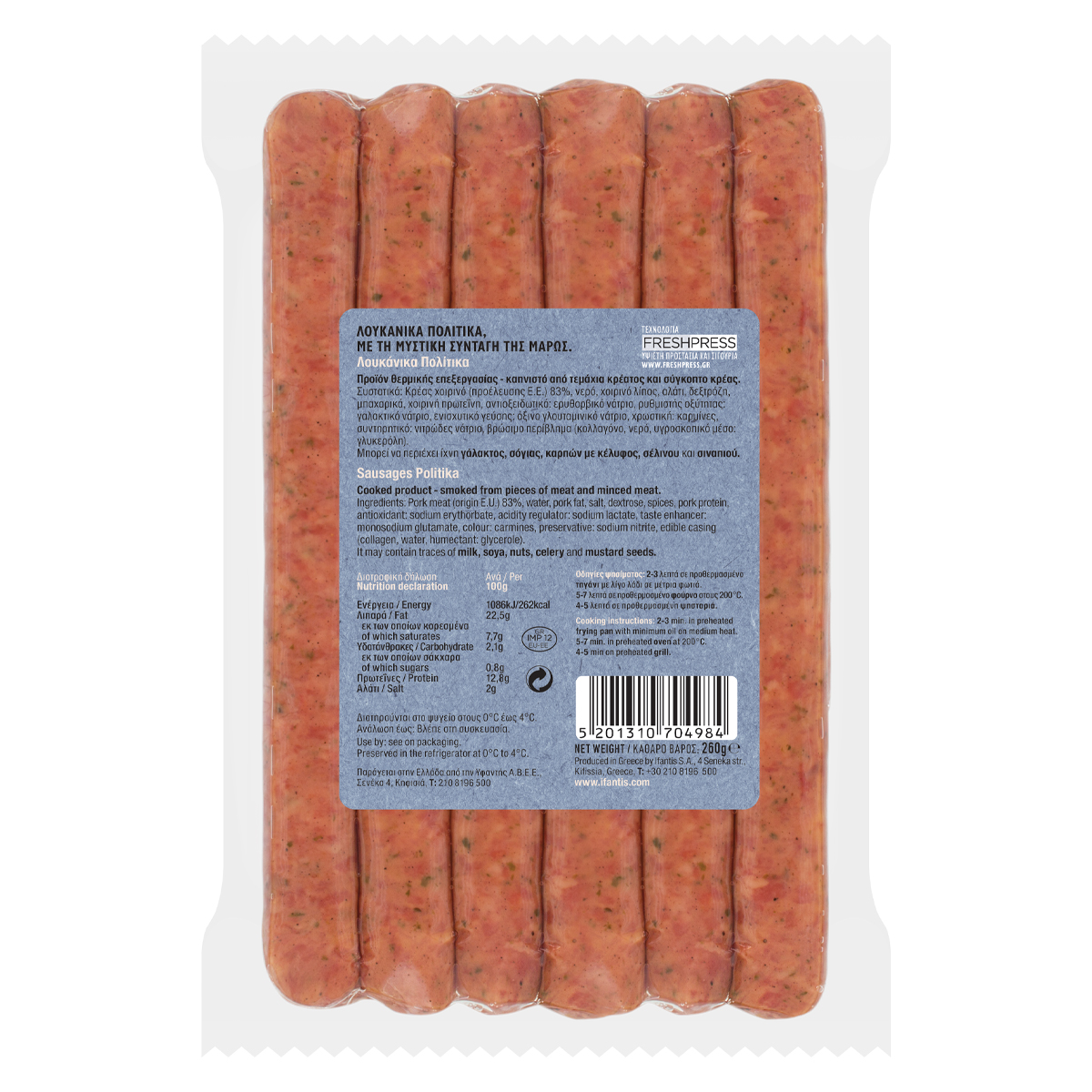 Enjoy the delicious taste of traditional Polish sausages, no matter how you cook them: grilled, fried or boiled. Semi-dry - smoked product, made from selected pieces of fine pork meat. Rich taste. Gluten-free. Packed with the innovative FRESHPRESS technology that offers the best possible protection and safety in food production, keeping the taste and nutrients unaltered for a longer period of time after opening the package. With the Ifantis quality guarantee.