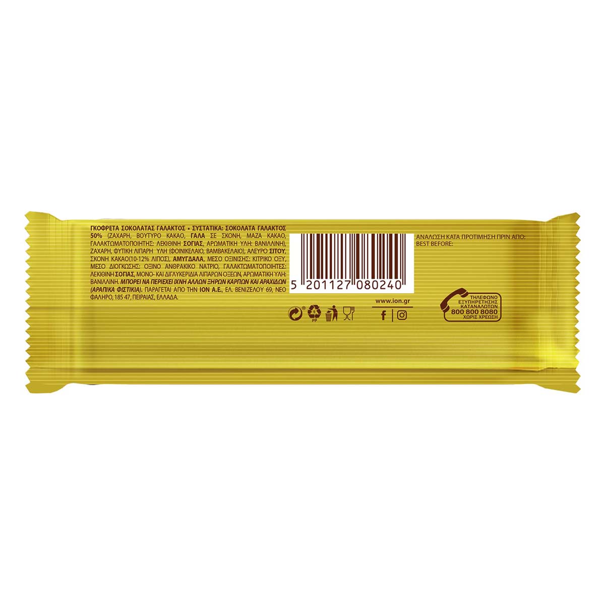Σοκολάτα ΓΑΛΑΚΤΟΣ 50% (ζάχαρη, βούτυρο κακάο, ΓΑΛΑ σε σκόνη, μάζα κακάο, γαλακτωματοποιητής: λεκιθίνη ΣΟΓΙΑΣ, αρωματική ύλη: βανιλλίνη), ζάχαρη, φυτική λιπαρή ύλη (φοινικέλαιο, βαμβακέλαιο), άλευρο ΣΙΤΟΥ, σκόνη κακάο (10-12% λίπος), ΑΜΥΓΔΑΛΑ, μέσο οξίνισης: κιτρικό οξύ, μέσο διόγκωσης: όξινο ανθρακικό νάτριο, γαλακτωματοποιητές: λεκιθίνη ΣΟΓΙΑΣ, μονο- και διγλυκερίδια λιπαρών οξέων, αρωματική ύλη: βανιλλίνη.