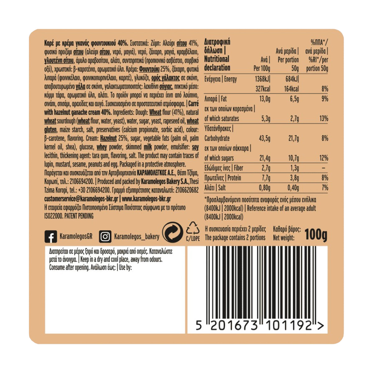 ΚΑΡΑΜΟΛΕΓΚΟΣ Α.Ε. Διεύθυνση Αρτοβιομηχανίας Καραμολέγκος Α.Ε. Θέση Τζήμα, Κορωπί – Τηλ.: +30 210 6694200 – Γραμμή εξυπηρέτησης καταναλωτή +30 210 6620682