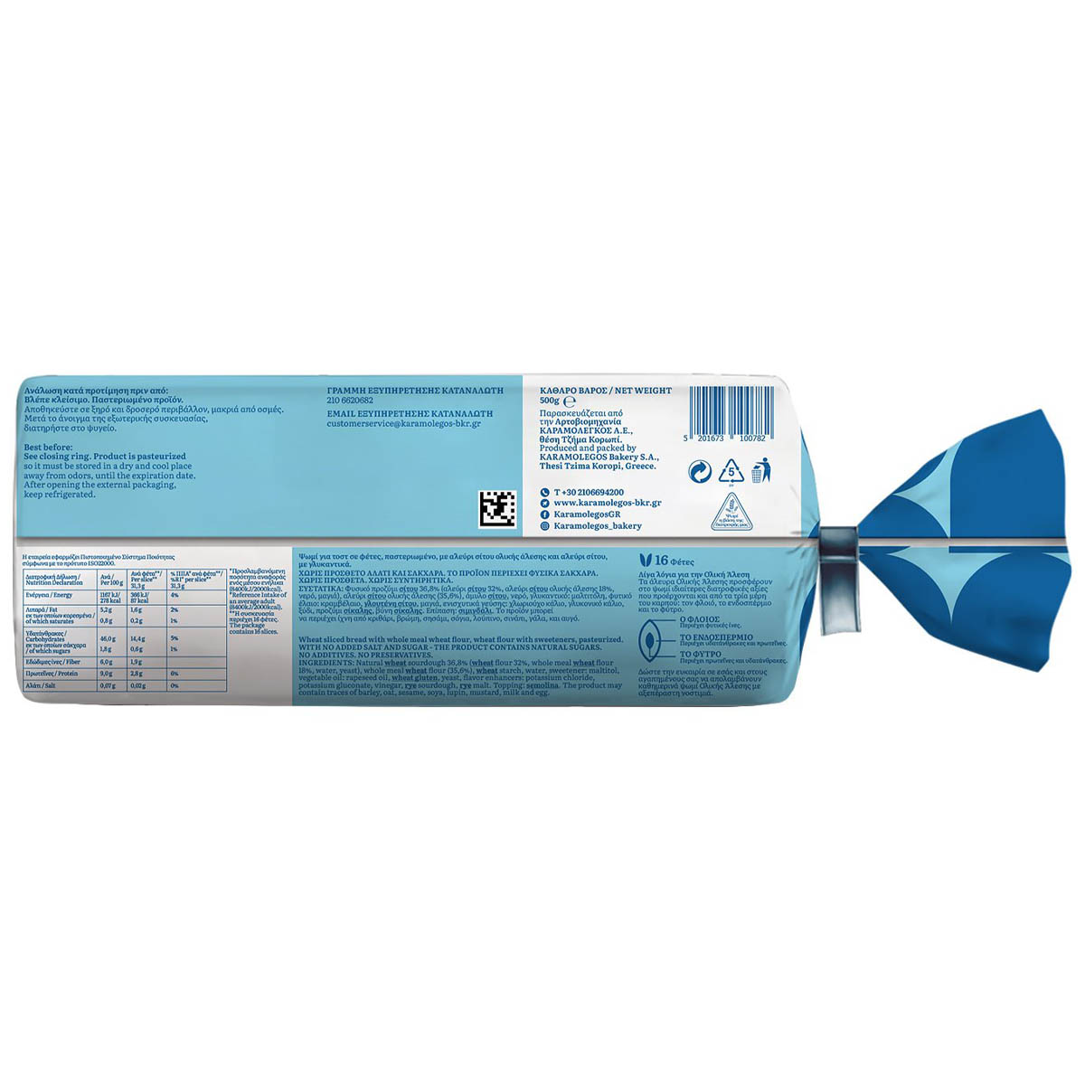 Sliced toast bread, pasteurized, with whole wheat flour and wheat flour, with sweeteners. No additives. No preservatives.