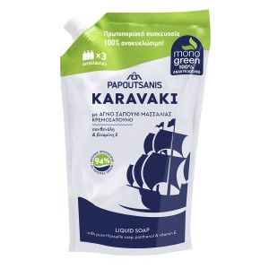 Authenticity and purity meet tradition, through the new cream soap KARAVAKI PAPOUTSANIS. Its gentle formula, with 94% ingredients of natural origin, is enriched with panthenol and vitamin E and deeply cleanses while moisturizing and protecting your hands. Ideal for the whole family. Fill your KARAVAKI cream soap pump again and again with KARAVAKI replacement cream soap sachets, made from 100% recyclable material, thus contributing with us to a more sustainable future with less plastic.