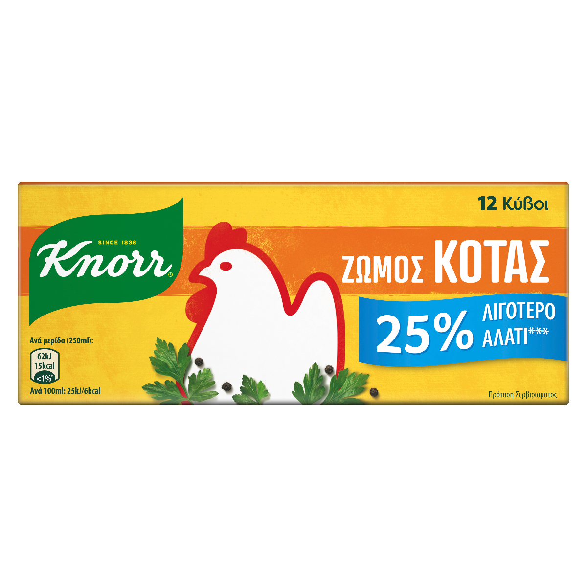 Οι νέοι Knorr Κύβοι Κότας Λιγότερο Αλάτι είναι η τέλεια επιλογή για φαγητό με πλούσια γεύση και με 25% λιγότερο αλάτι από τον κλασσικό μας κύβο.