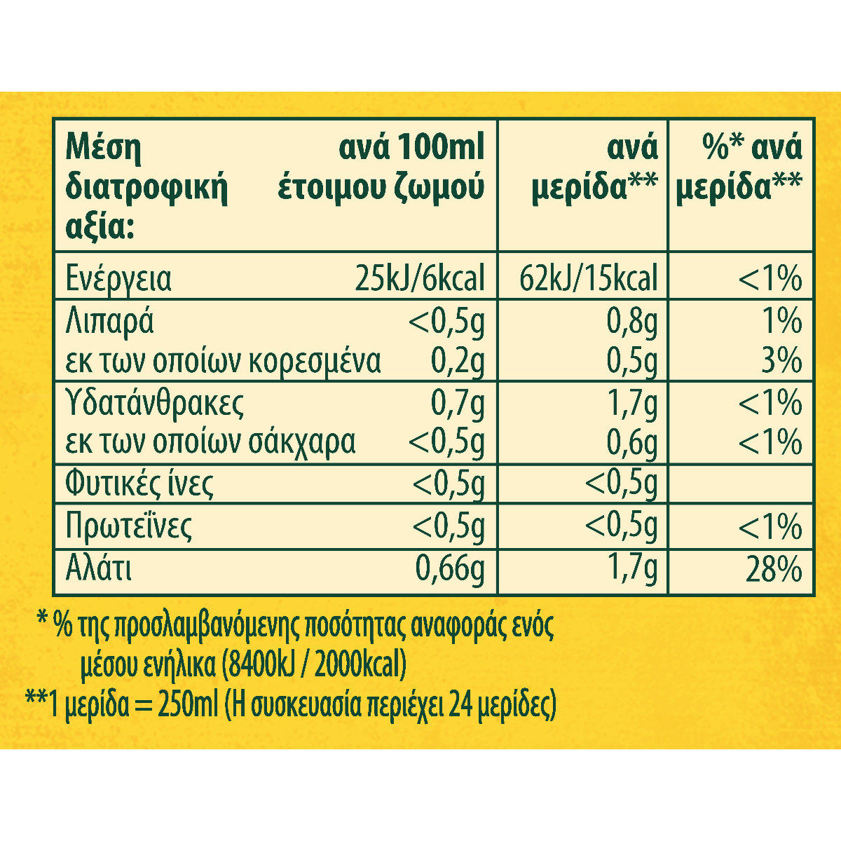 * DISCLAIMER: Chalkiadakis SA, always respecting its consumers, strives to provide reliable information on its website, based on the data it receives from its suppliers. However, Chalkiadakis SA informs that there may be discrepancies between the information provided and that on product labels, for technical reasons that may be due to stock updates. The information presented on the website does not in any way replace the information on the product labels, and in case of any discrepancy, the information on the product labels always prevails. Consumers must check the information on the labels before purchasing and before consuming the product and always consume it according to the intended use defined by the supplier. In case of disagreement, the consumer expressly waives any right of appeal against Chalkiadakis SA.