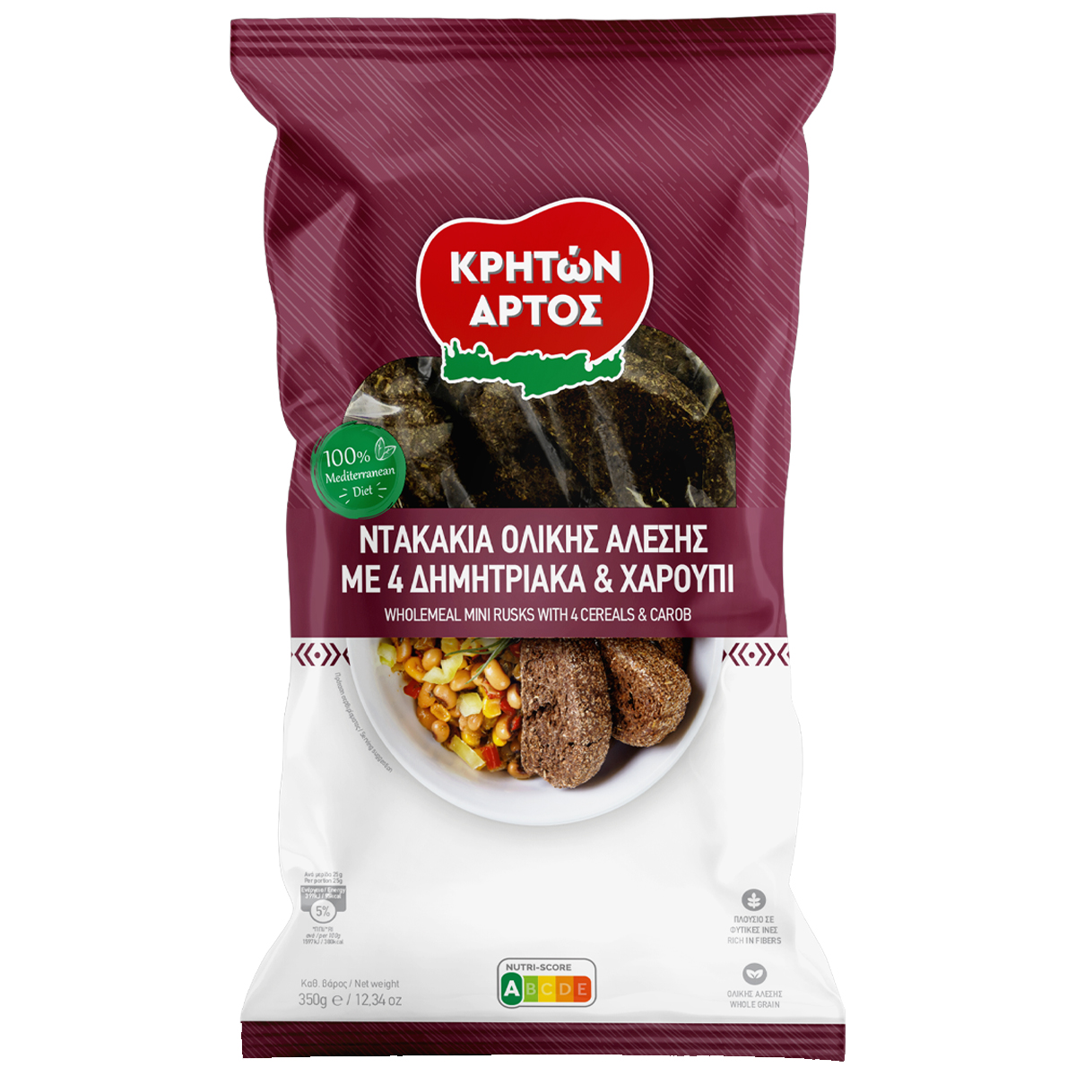 Nuts with four cereals and carob, known for its nutritional elements since ancient times and the Minoan era. The combination of wholemeal flour, oats and carob creates a highly stimulating, tasty and fibre-rich meal that helps the body to function well.