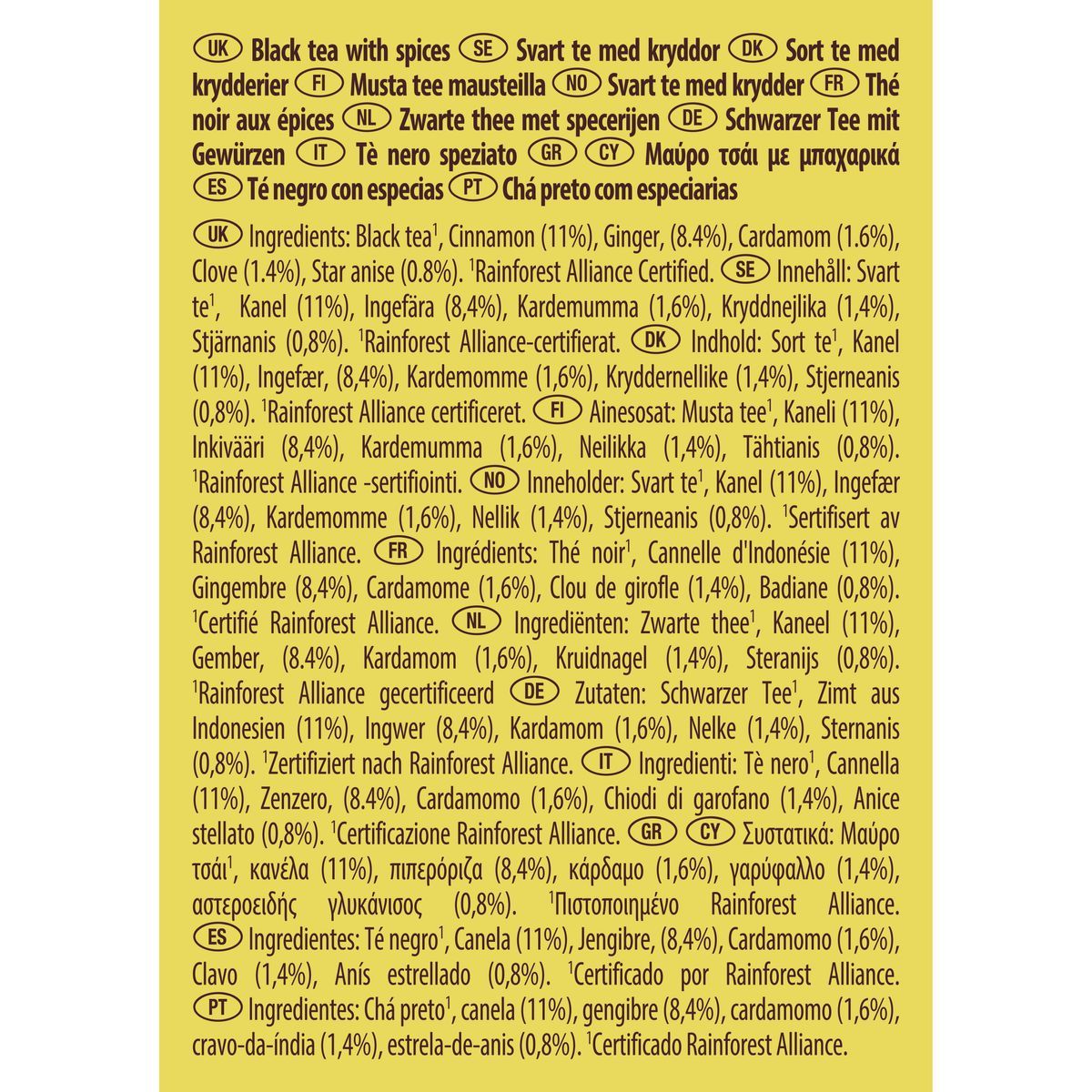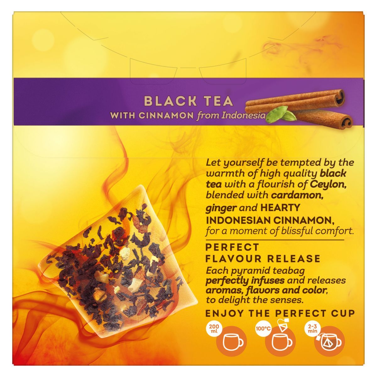 Η πικάντικη ζεστασιά του μαύρου αρωματισμένου τσαγιού στο Lipton Chai. Αναμεμειγμένο από ειδικούς του τσαγιού, ένα γευστικό μαύρο τσάι με μια πινελιά Κεϋλάνης που συνδυάζει ένα συναρπαστικό μείγμα αρωματικού κάρδαμου, πικάντικου τζίντζερ και απαλής ινδονησιακής κανέλας για στιγμές απόλαυσης.