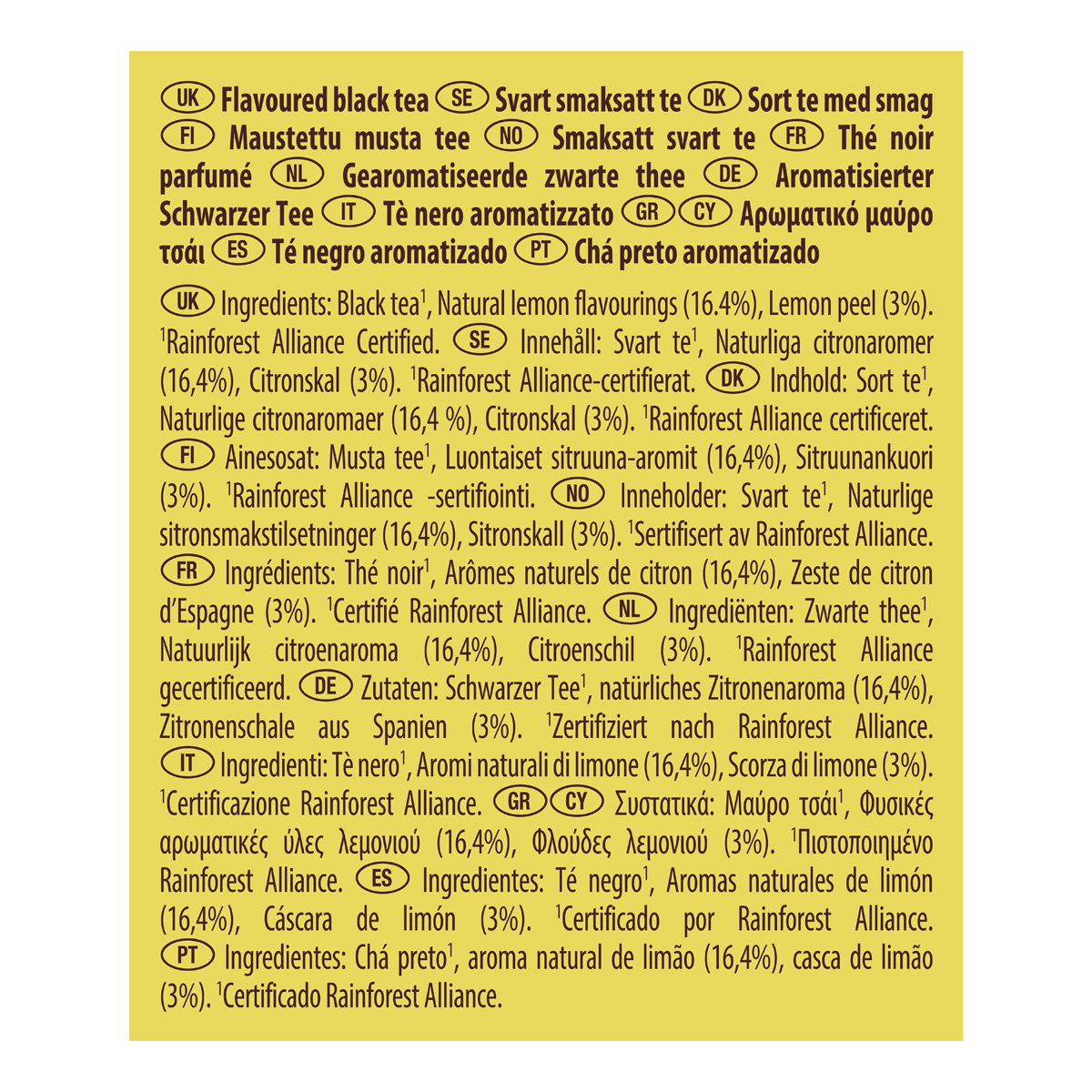 Ένα αναζωογονητικό γευστικό μαύρο τσάι αναμεμειγμένο με κομματάκια από λεμόνια Ισπανίας για μια στιγμή ζωηρής απόλαυσης. Ξεκινήστε ένα συναρπαστικό ταξίδι ανακάλυψης με το Lipton Lemon, ένα λαμπερό και γευστικά πλούσιο τσάι.