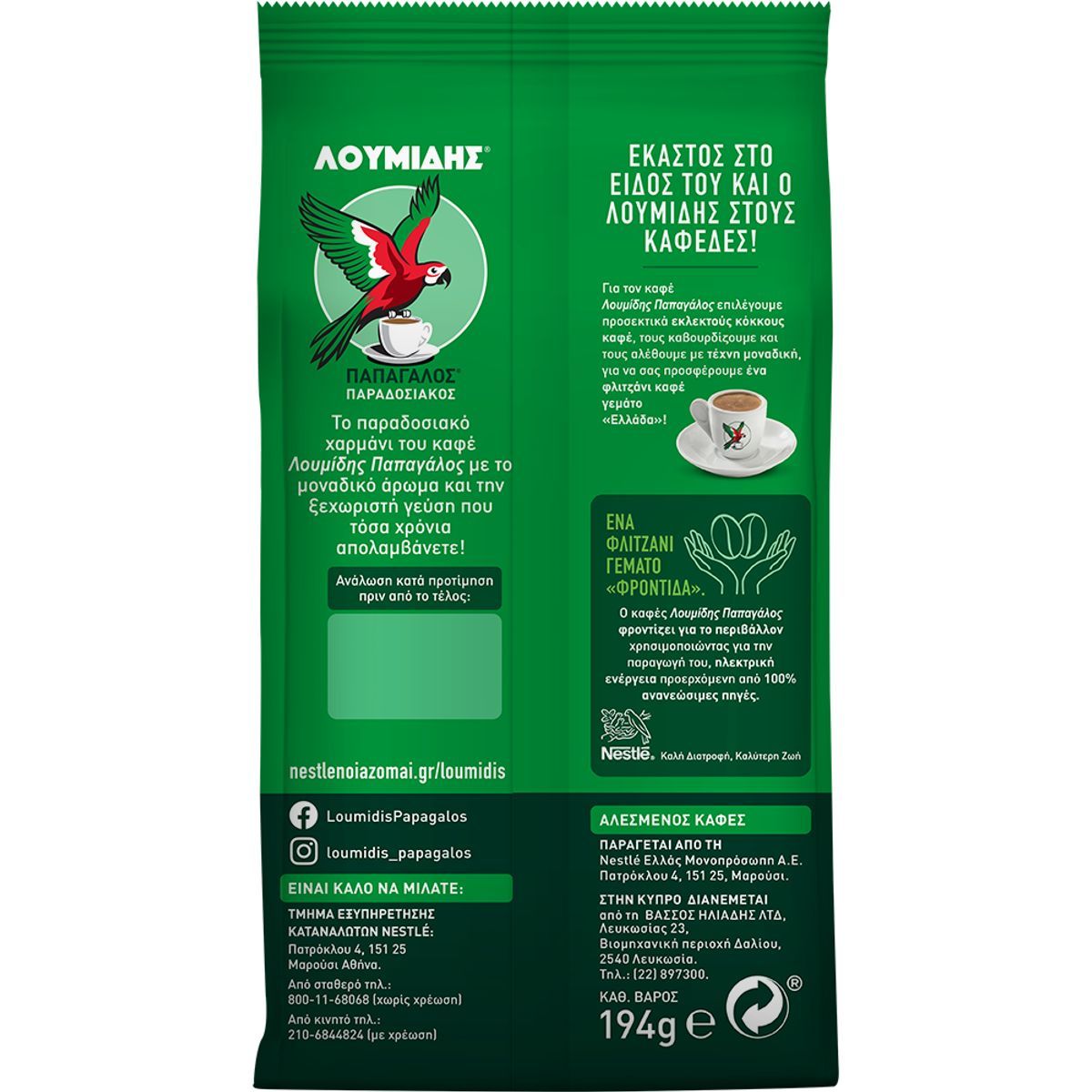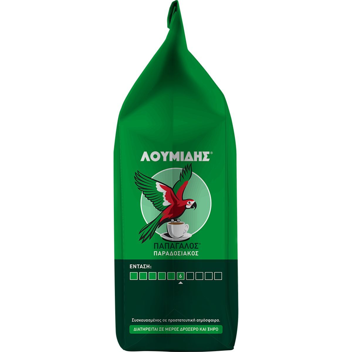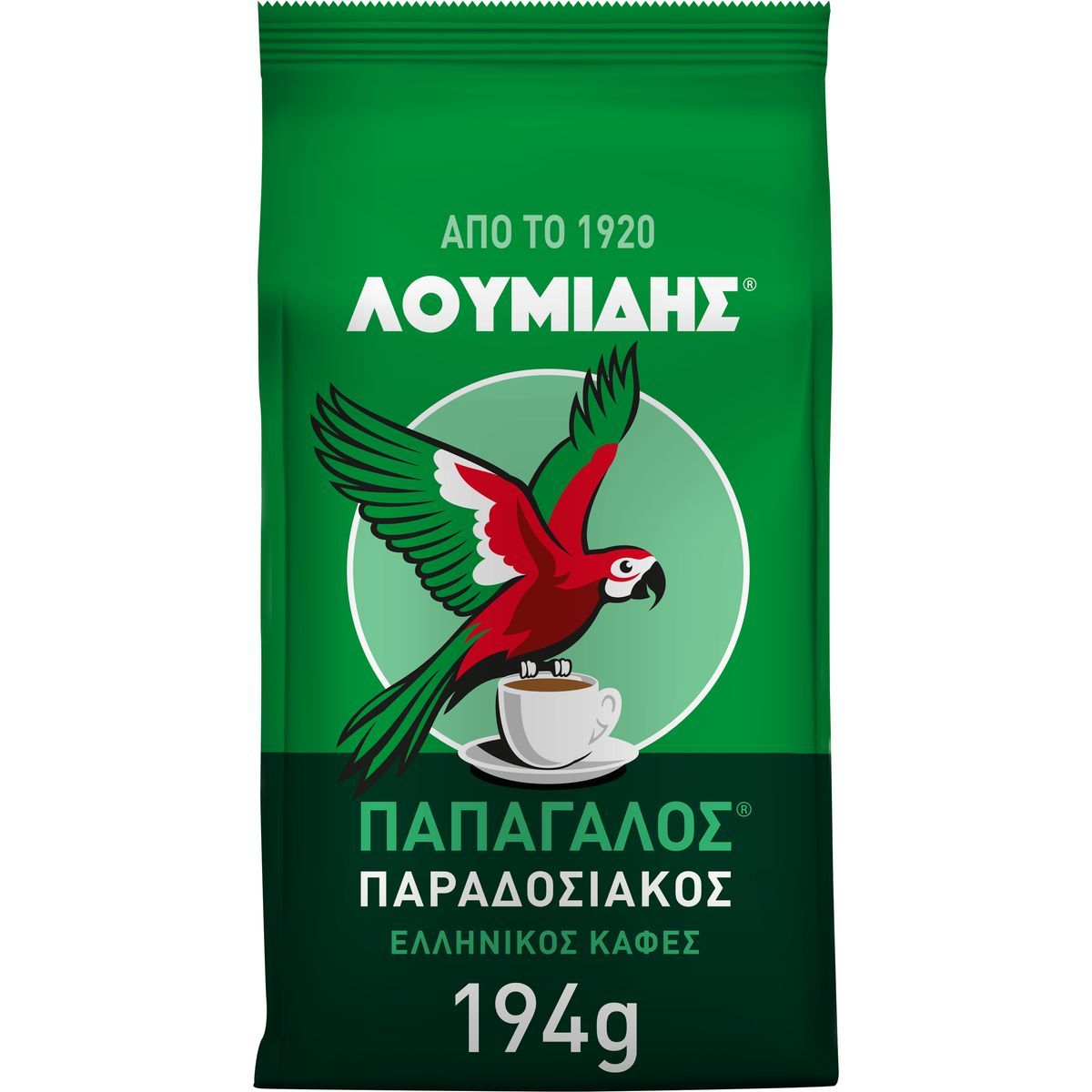 The beloved Greek coffee LOUMIDIS® PAPAGALOS® now more refreshed than ever with a new visual and logo, but with the same beloved, exquisite and excellent quality blend. With the unique aroma and distinct taste that so many of you enjoy! They have been with us since 1920 and unite us with all that we love... the people and our Place. LUMIDIS® PAPAGALOS® a cup full of "Greece". Loumidis Papagalos coffee takes care of the environment by using electricity from 100% renewable sources for its production. Ground coffee. 100% natural coffee.