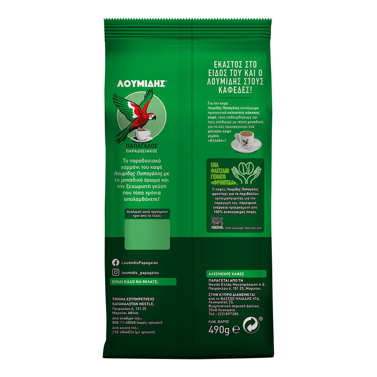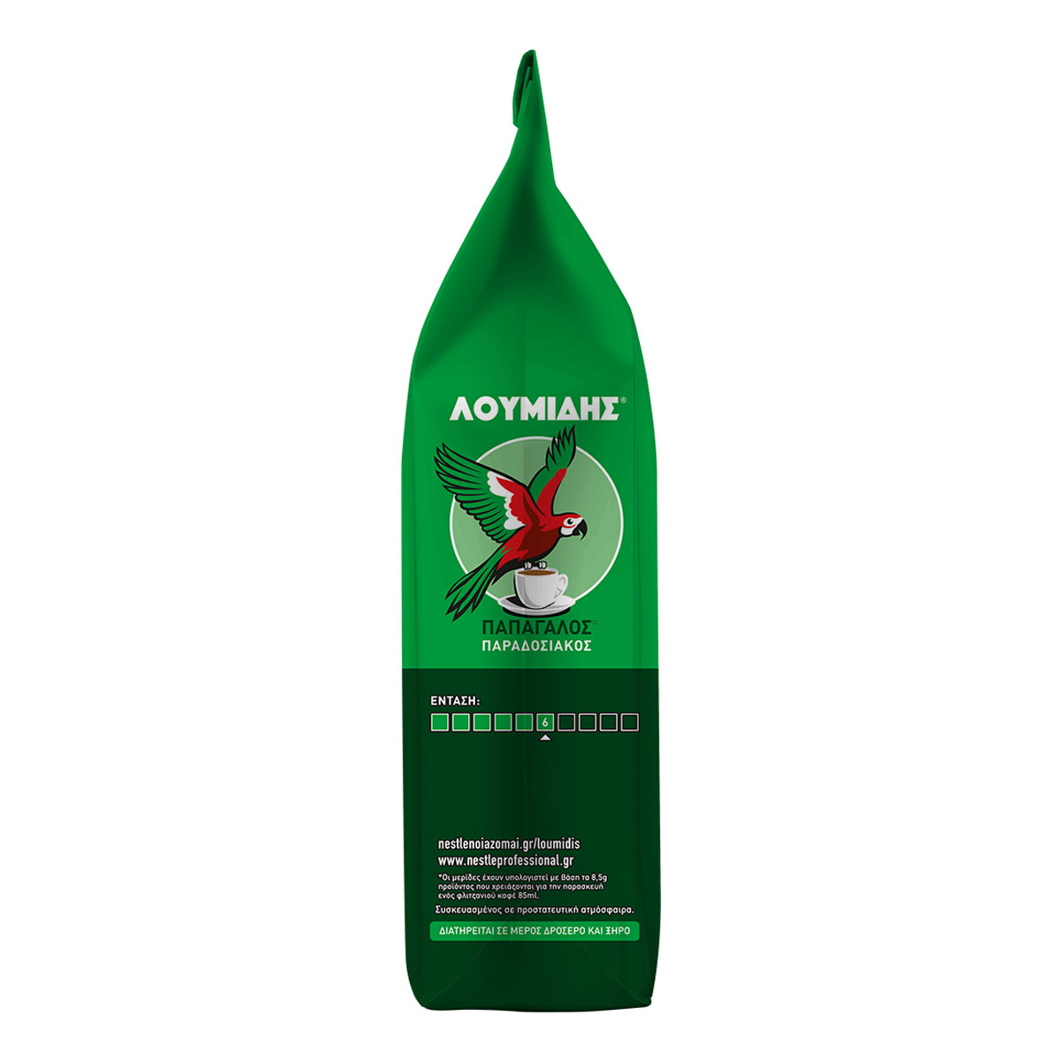 The traditional blend of LOUMIDIS® PAPAGALOS® coffee with the unique aroma and the special taste that you have enjoyed for so many years!Each in its own way and LOUMIDIS in coffees! For LOUMIDIS® PAPAGALOS® coffee, we carefully select fine coffee beans, roast and grind them with a unique art, to offer you a cup full of "Greece".A cup full of "care". Loumidis Papagalos coffee takes care of the environment by using electricity from 100% renewable sources for its production.