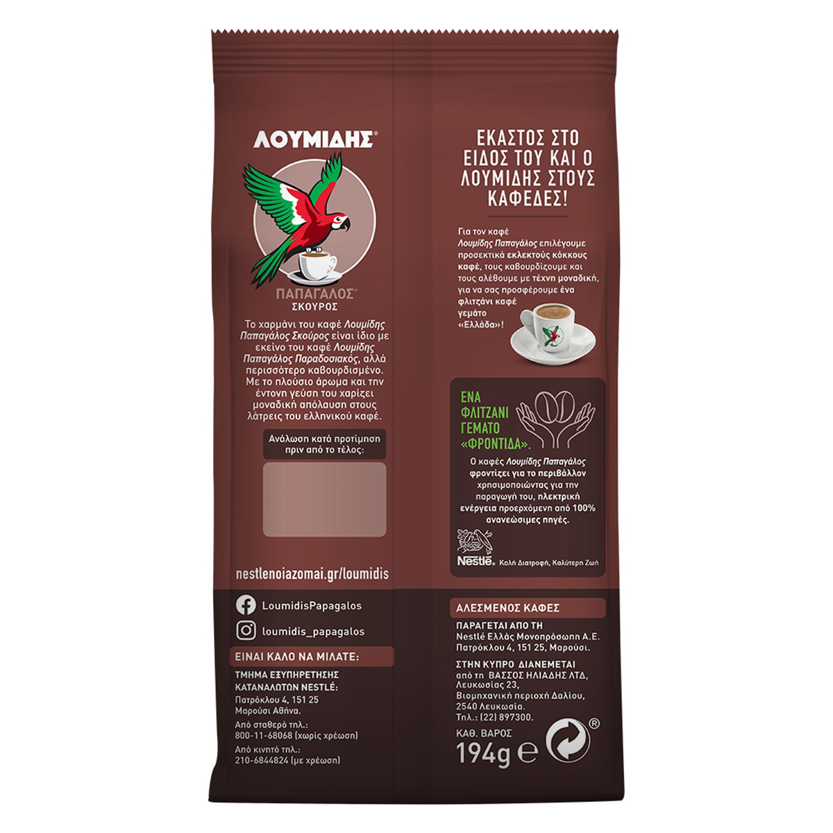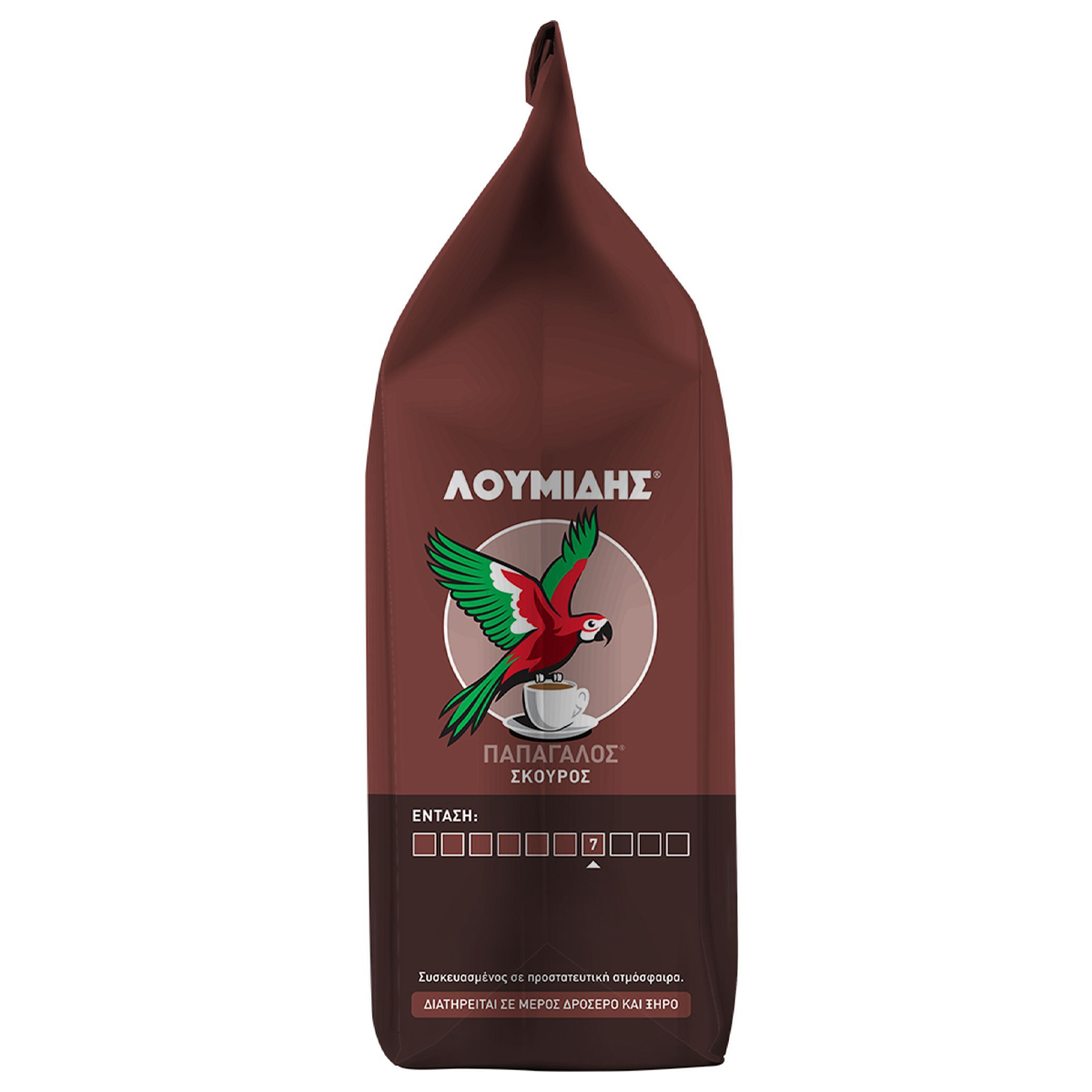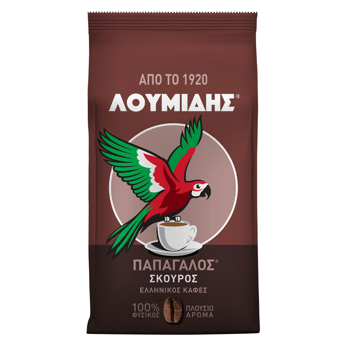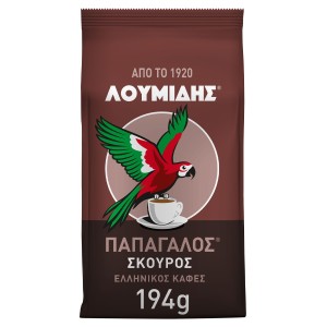 The blend of LOUMIDIS® PAPAGALOS® Dark coffee is the same as that of LOUMIDIS® PAPAGALOS® Traditional coffee, but more roasted. With its rich aroma and intense taste, it offers a unique pleasure to Greek coffee lovers. Loumidis Papagalos coffee takes care of the environment by using electricity from 100% renewable sources for its production. Ground coffee. 100% natural coffee.