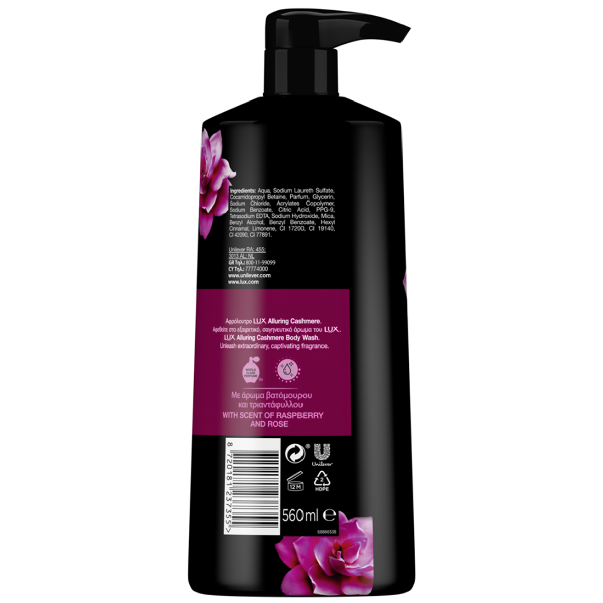Aqua, Sodium Laureth Sulfate, Cocamidopropyl Betaine, Parfum, Glycerin, Sodium Chloride, Acrylates Copolymer, Sodium Benzoate, Citric Acid, PPG-9, Tetrasodium EDTA, Sodium Hydroxide, Mica, Benzyl Alcohol, Benzyl Benzoate, Hexyl Cinnamal, Limonene, CI 17200, CI 19140, CI 42090, CI 77891.
