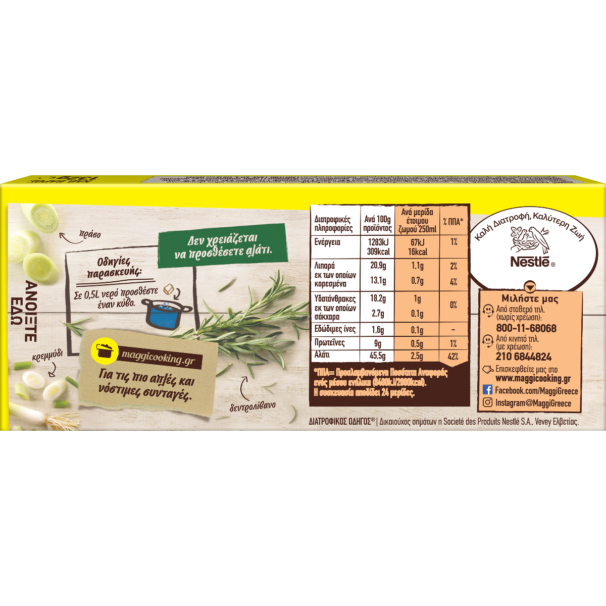 Produced in Germany by Maggi GmbH, 78221 Singen (Hohentwiel) ® Reg. Trademark of Societe des Produits Nestle S.A. and distributed by NESTLE HELLAS MONOPROSOPI S.A. Distributor for Cyprus: Vassos Eliades Ltd., 23 Lefkosiasia Street, 23, BΠ Daliou 2540 Nicosia, tel. (22)897300.