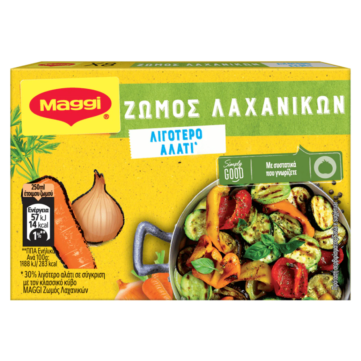 Ζωμός λαχανικών. Ενισχύστε την γεύση των σπιτικών σας μαγειρεμάτων με τους κύβους MAGGI! Στους κύβους MAGGI τα λαχανικά αποξηραίνονται και κλείνονται μέσα σε ένα μικρό κύβο, απελευθερώνοντας όλη τους τη νοστιμιά και τη πλούσια γεύση στο φαγητό. Ο ΜΑGGI ΖΩΜΟΣ ΛΑΧΑΝΙΚΩΝ με λιγότερο αλάτι* δίνει απολαυστική γεύση στο φαγητό σας. *30% λιγότερο αλάτι σε σύγκριση με τον κλασσικό κύβο MAGGI ΖΩΜΟΣ ΛΑΧΑΝΙΚΩΝ.