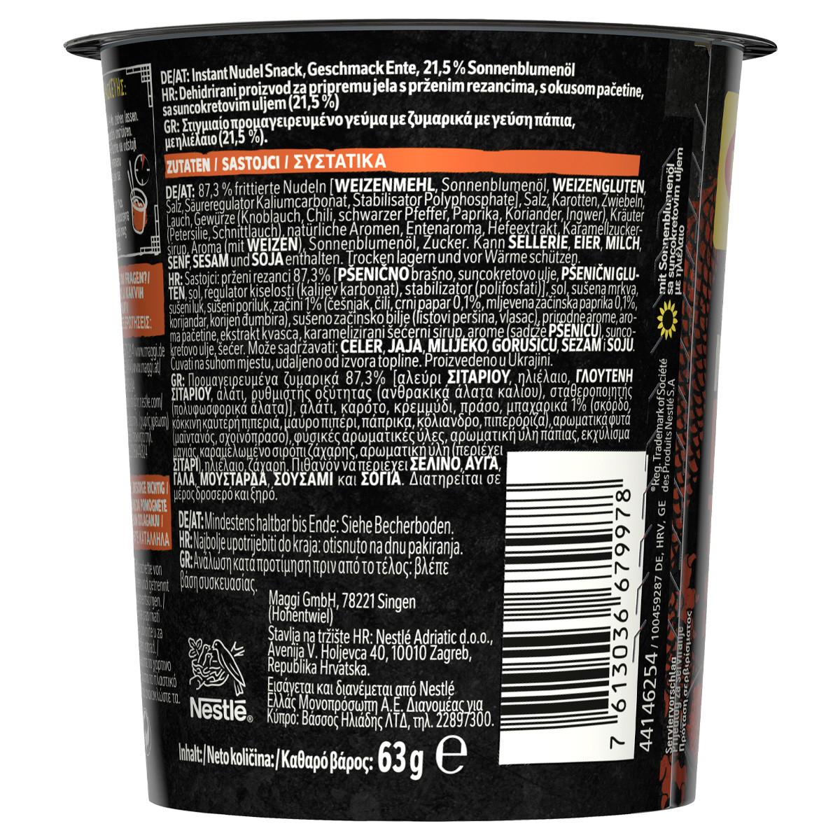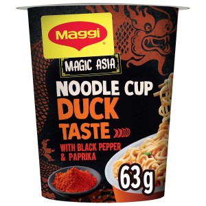 Instant pre-cooked meal with duck-flavoured noodles with 22% sunflower oil. Enjoy MAGGI MAGIC ASIA MAGIC NOODLES Cup with duck flavor, the ideal snack for all hours! A delicious and satisfying meal, consisting of noodles and a mixture of dried spices. An easy and quick snack to prepare with very simple preparation instructions.