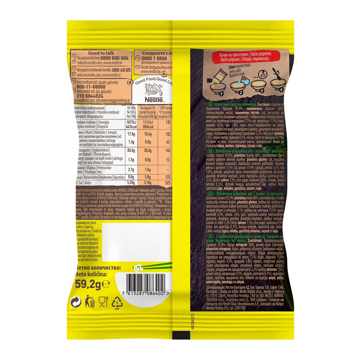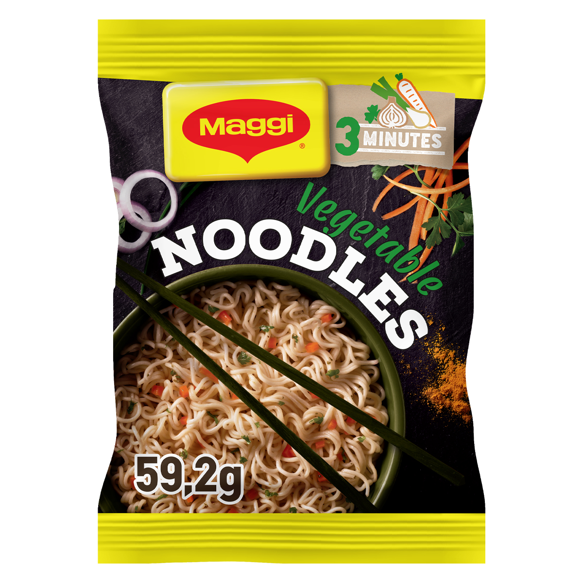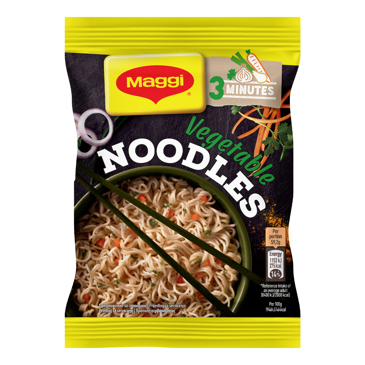 Instant pre-cooked meal with noodles and vegetable and spice powder mix. MAGGI brings Asian flavors to your plate in just 3 minutes! Enjoy MAGGI NOODLES with dried vegetables, the perfect snack for all hours! A delicious and filling meal, consisting of noodles and a mixture of dried vegetables and spices. An easy and quick snack to prepare with very simple preparation instructions.