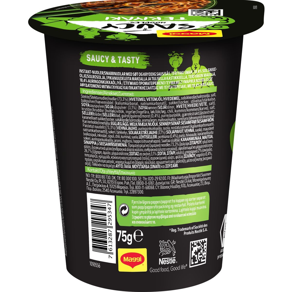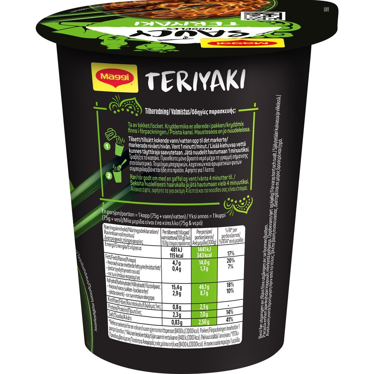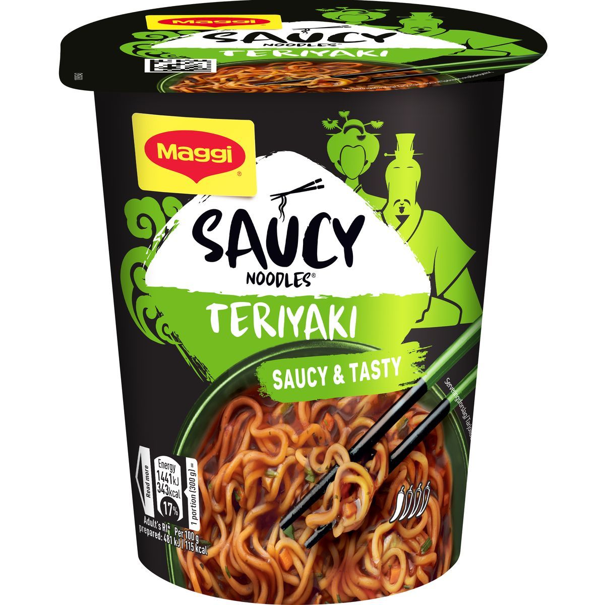 Στιγμιαίο προμαγειρεμένο γεύμα με ζυμαρικά noodles σε αφυδατωμένο μίγμα γλυκιάς και πικάντικης σάλτσας με γεύση τεριγιάκι, με 18,4% ηλιέλαιο. Η ΜAGGI φέρνει στο πιάτο σας αυθεντικές ασιατικές γεύσεις σε 4 μόνο λεπτά! Το MAGGI Saucy Noodles Τεριγιάκι Cup αποτελεί ένα πεντανόστιμο και παράλληλα εύκολο στην παρασκευή του γεύμα, που θα σας ταξιδέψει σε ένα κόσμο έθνικ γεύσεων. Ελαφρώς πικάντικο και πολύ γευστικό, με πεντανόστιμη σάλτσα Teriyaki, όπως την έχετε συνηθίσει σε ένα Ασιατικό εστιατόριο, το ιδανικό σνακ για όλες τις ώρες! Απολαύστε ένα χορταστικό γεύμα, σε πολύ οικονομική τιμή, έτοιμο μέσα σε λίγα λεπτά. Χάρη στην πρακτική του συσκευασία μπορεί να καταναλωθεί οπουδήποτε, οποιαδήποτε στιγμή της ημέρας! Δοκιμάστε το και αφήστε το να σας ταξιδέψει με την υπέροχη γεύση του!