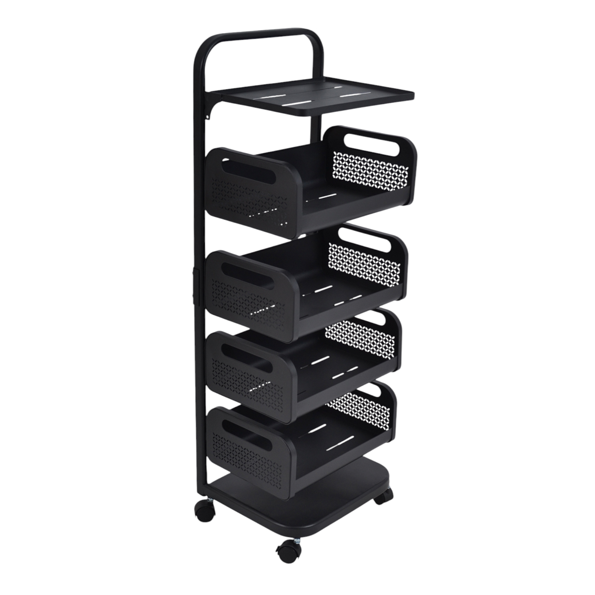 Πρακτικό μεταλλικό τρόλεϊ αποθήκευσης και οργάνωσης σε μαύρο ματ χρώμα.Διαθέτει τέσσερα καλάθια με ενσωματωμένες χειρολαβές για εύκολη πρόσβαση κ δύο ράφια.Ιδανικό για οργάνωση στο σπίτι ή το γραφείο, προσφέρει ευελιξία χάρη στους περιστρεφόμενους τροχούς.