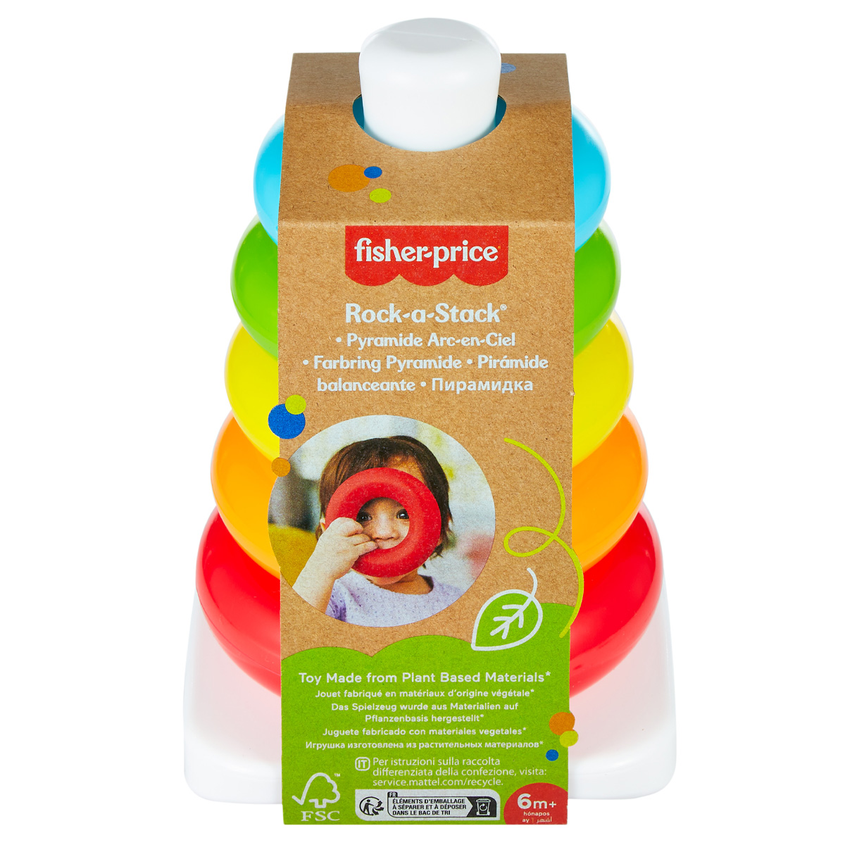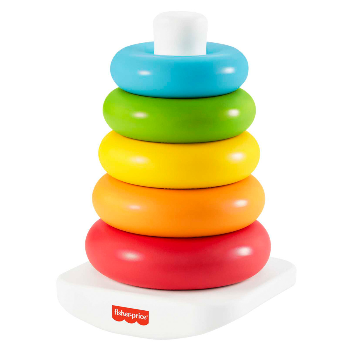 Which link will go to the top? The Fisher-Price Pyramid made from plant-based materials* is a classic baby toy. It consists of a rocking base and 5 coloured rings that little hands can catch and stack. This process develops their hand vision-movement coordination and teaches them the concept of size as they stack the rings from largest to smallest!