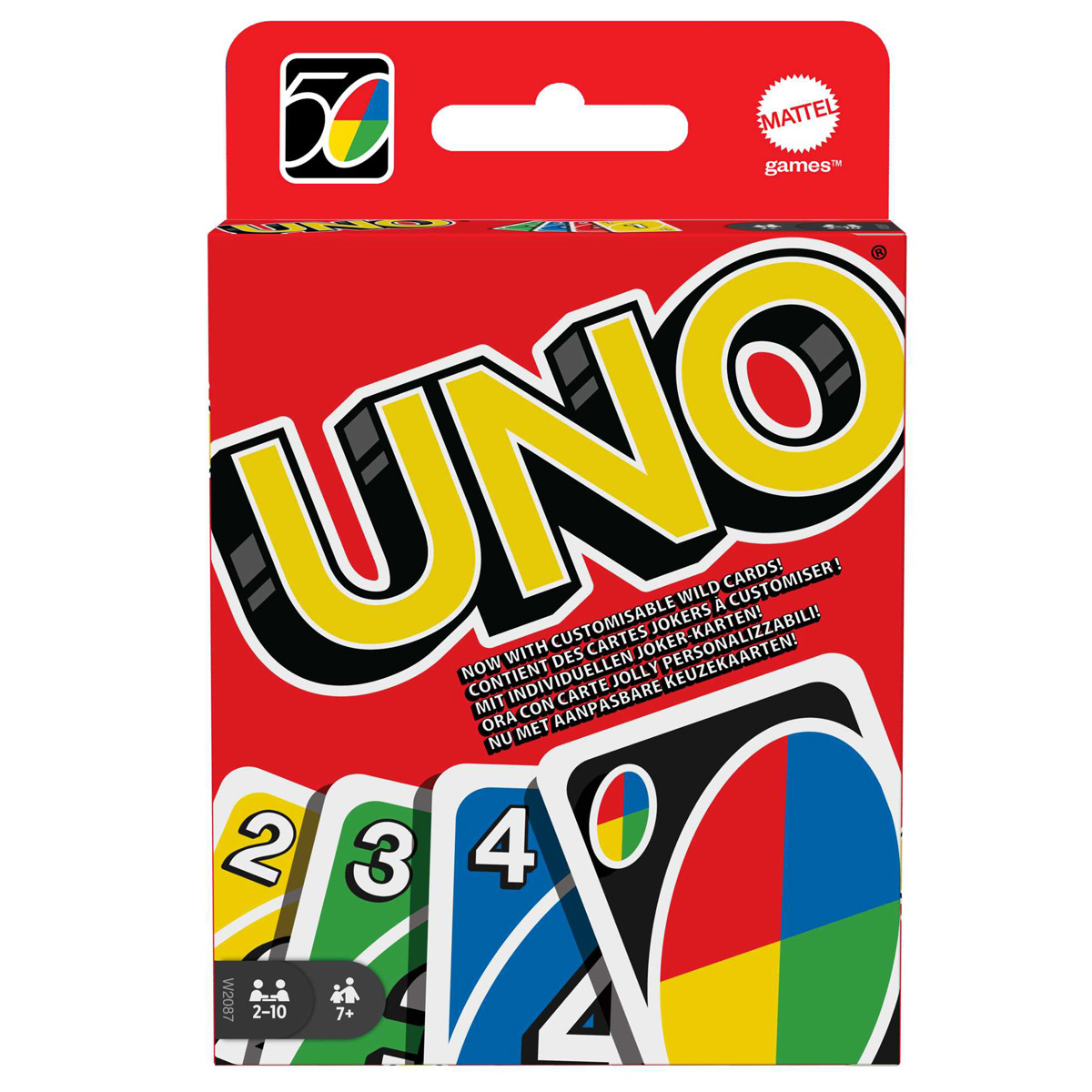 ?Easy to learn, hard to leave, UNO, the classic card game, now with new Wild Cards for more fun! Players match their cards with the number or color of the top card in the discard pile. Special Action Cards offer an exciting game with constant twists and turns! Play the 'Swap Your Cards' card with one of your opponents and the 3 Special Wild Cards to write your own rules! Included are 19 cards of the same suit (red, green, blue and yellow), 8 Take Two, Change of Face and No Next Player cards, in each suit, plus 4 Wild Cards, 4 Take 4 Wild Cards, 1 Swap Your Cards card and 3 Special Wild Cards. If you don't have any suitable cards to discard, then you must take one from the draw pile! Don't forget to shout 'UNO' when you're down to just one card! The first player to get rid of all their cards scores points by adding up the numbers of cards left to their opponents. The winner is the first player to reach 500 points. 112 cards and instructions are included.