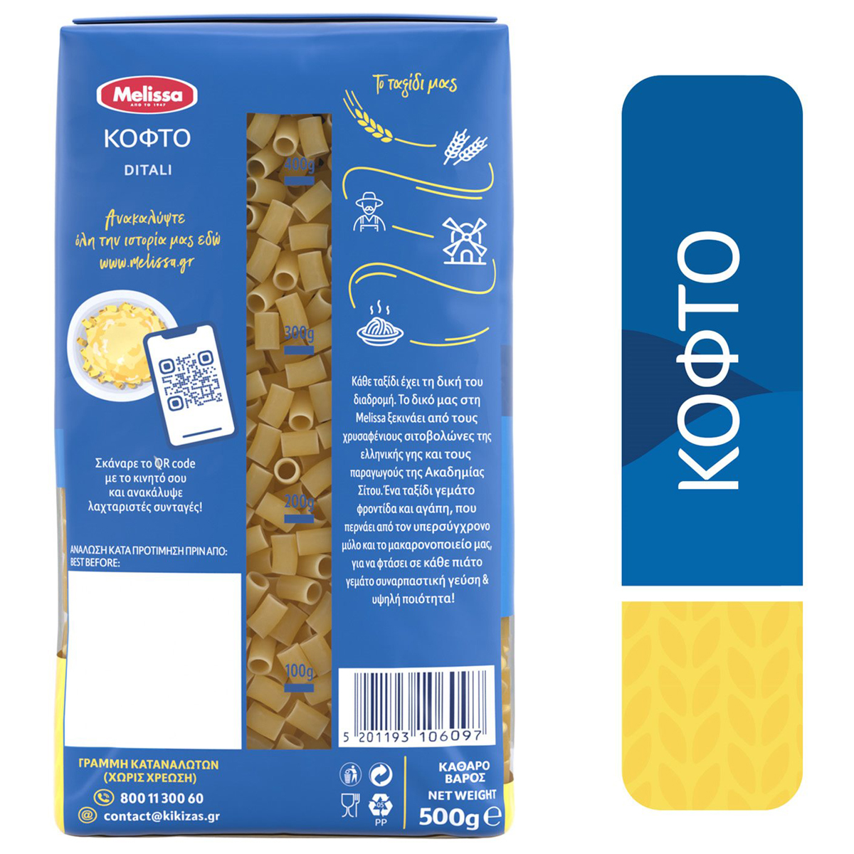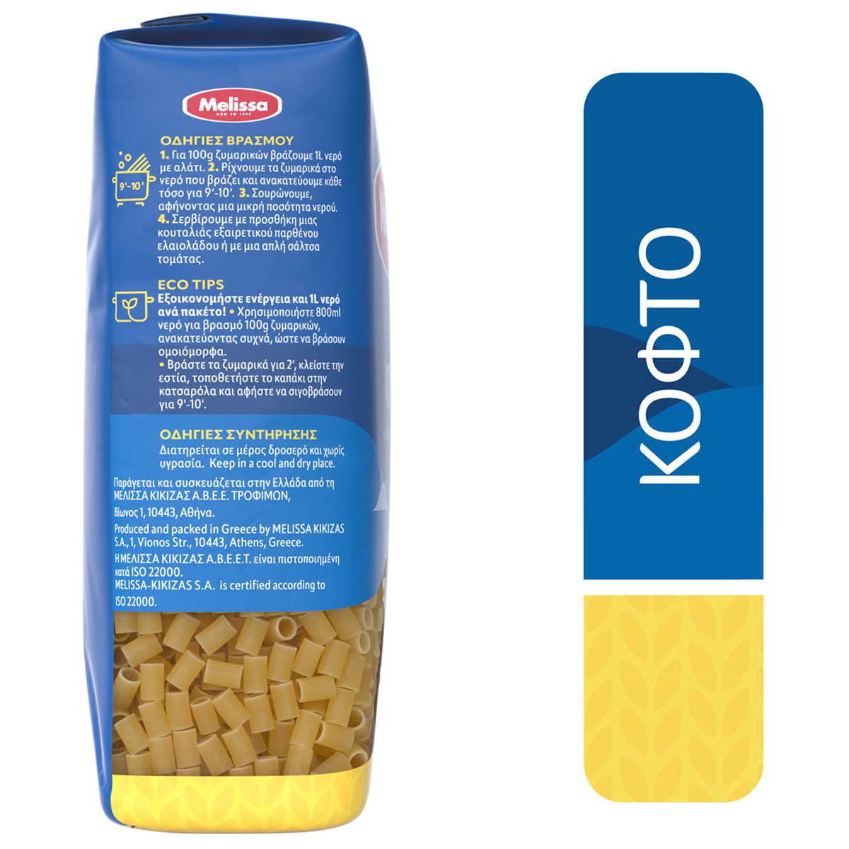 The Melissa spaghetti is produced from fine Greek wheat, acquiring a golden color and authentic taste. One of the most popular shapes of short pasta, it is mainly used in soups with meat or vegetables, with red sauces and in fasting recipes (e.g. with octopus).