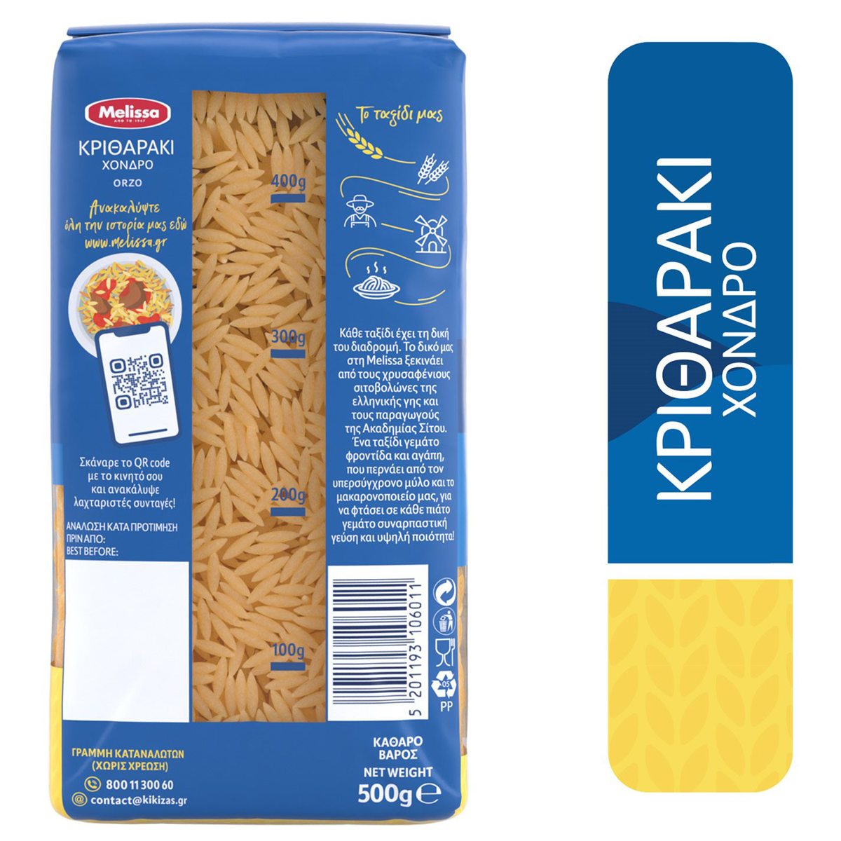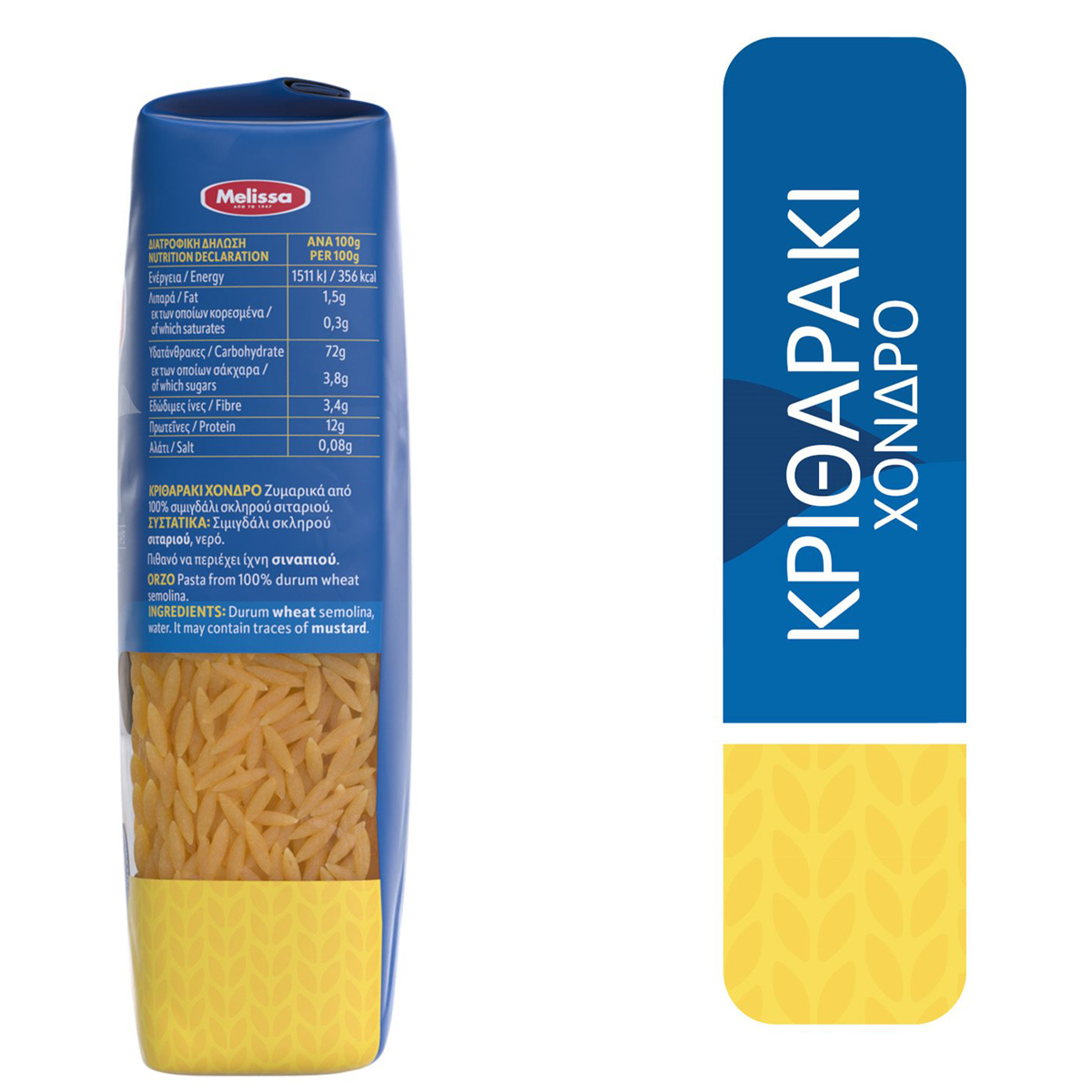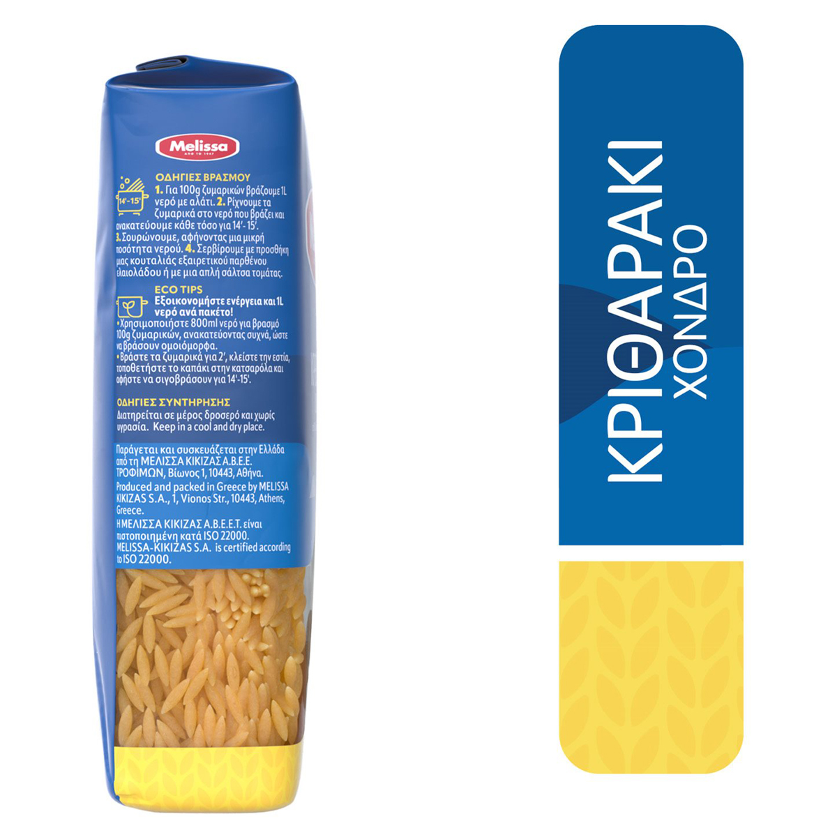 Melissa coarse barley is produced from fine Greek wheat, acquiring a golden color and authentic taste. One of the most famous shapes of fine pasta, it is ideal for traditional recipes such as casseroles and more modern ones such as barley.