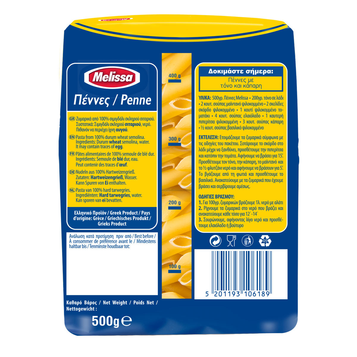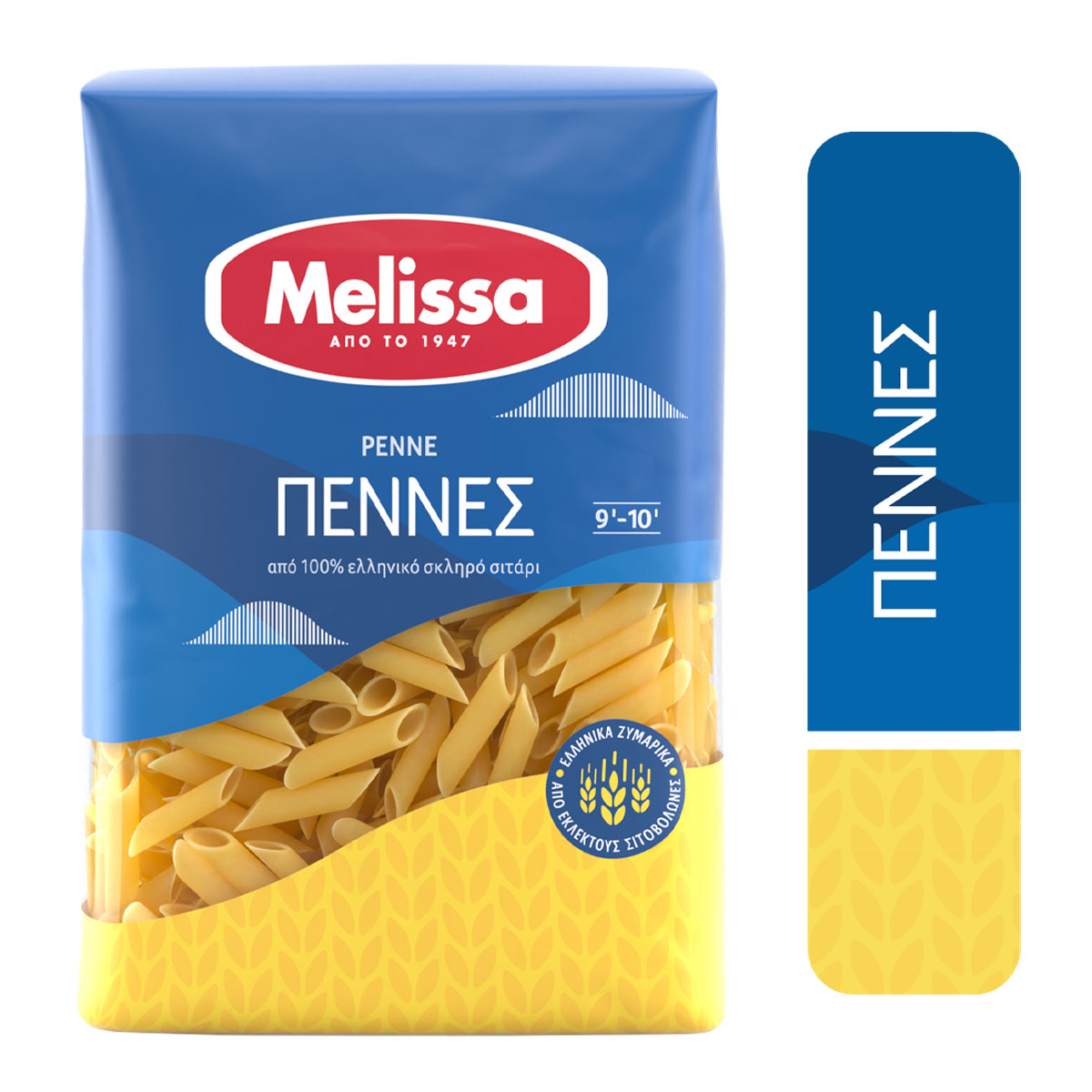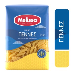 Melissa Penne are produced from fine Greek wheat, acquiring a golden color and authentic taste. One of the most beloved pasta shapes, Penne has the unique ability to hold the sauce.