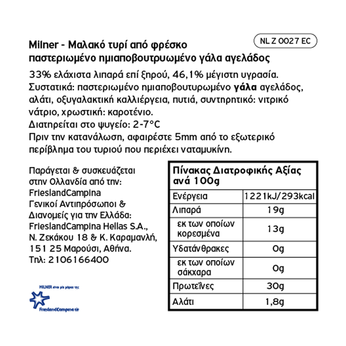 FRIESLANDCAMPINA HELLAS S.A., 18 N. Zekakou 18, 151 25 Maroussi, Athens - Tel: 210 6166400 Email: info@frieslandcampina.com Consumer Hotline (toll free) Tel: 800 11 668 668