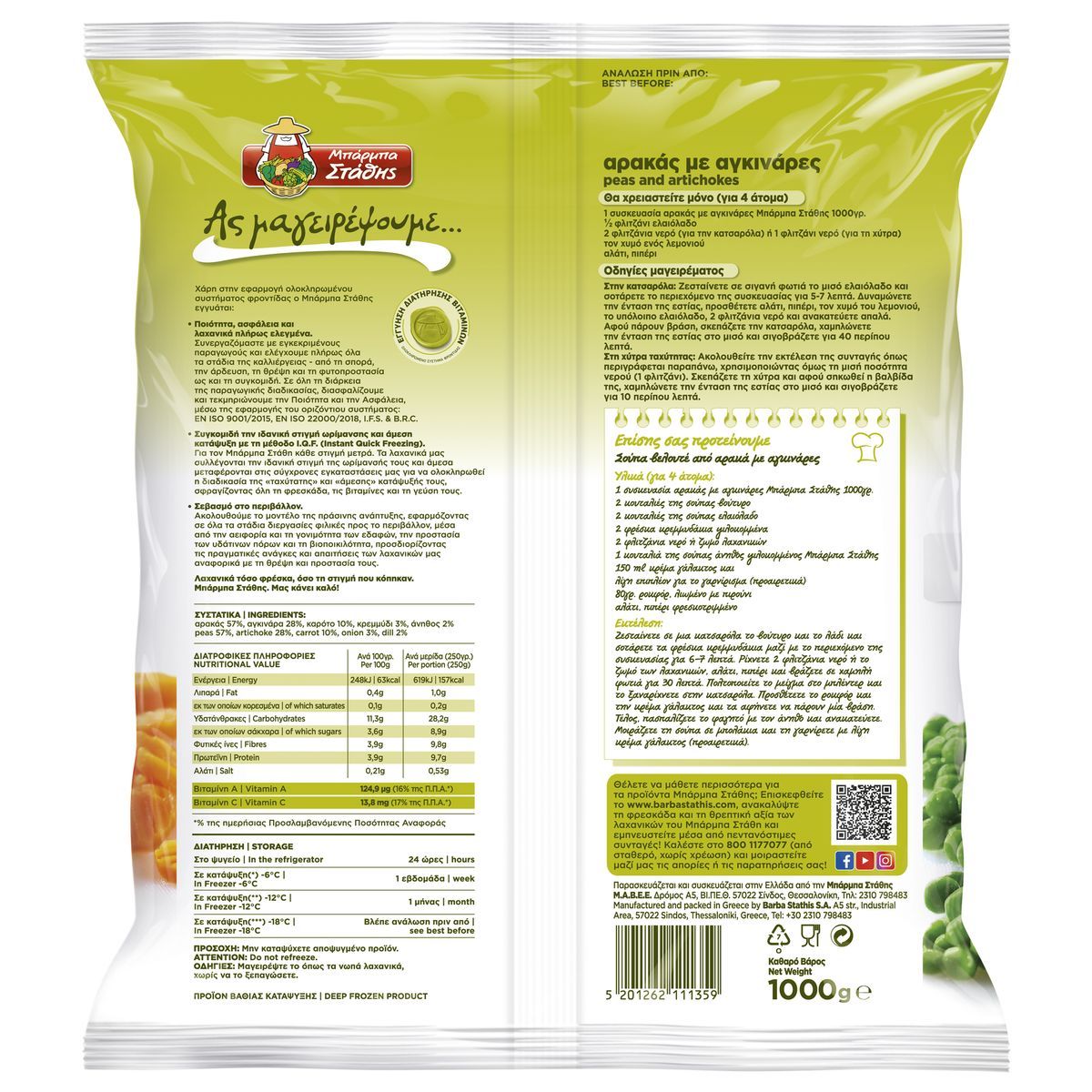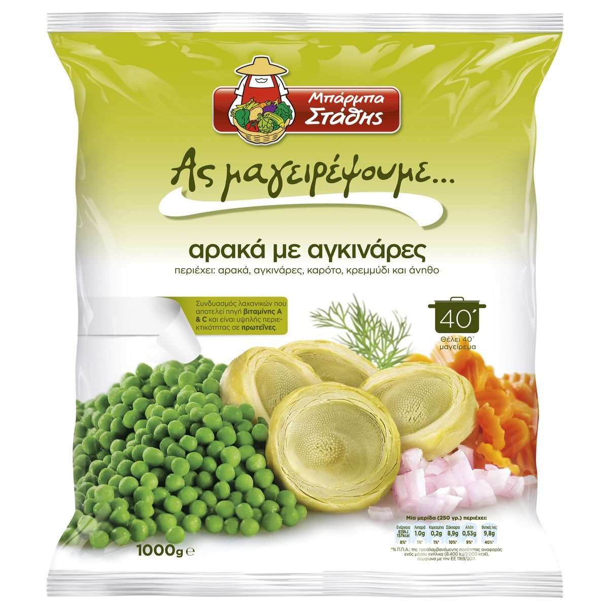 Peas with artichokes Barba Stathis is a very nutritious combination of vegetables that is ready to cook.It is very healthy, as it has a high protein content, while it is a source of edible fiber and vitamin A that helps maintain normal vision, as well as vitamin C that contributes to the normal functioning of the immune system.