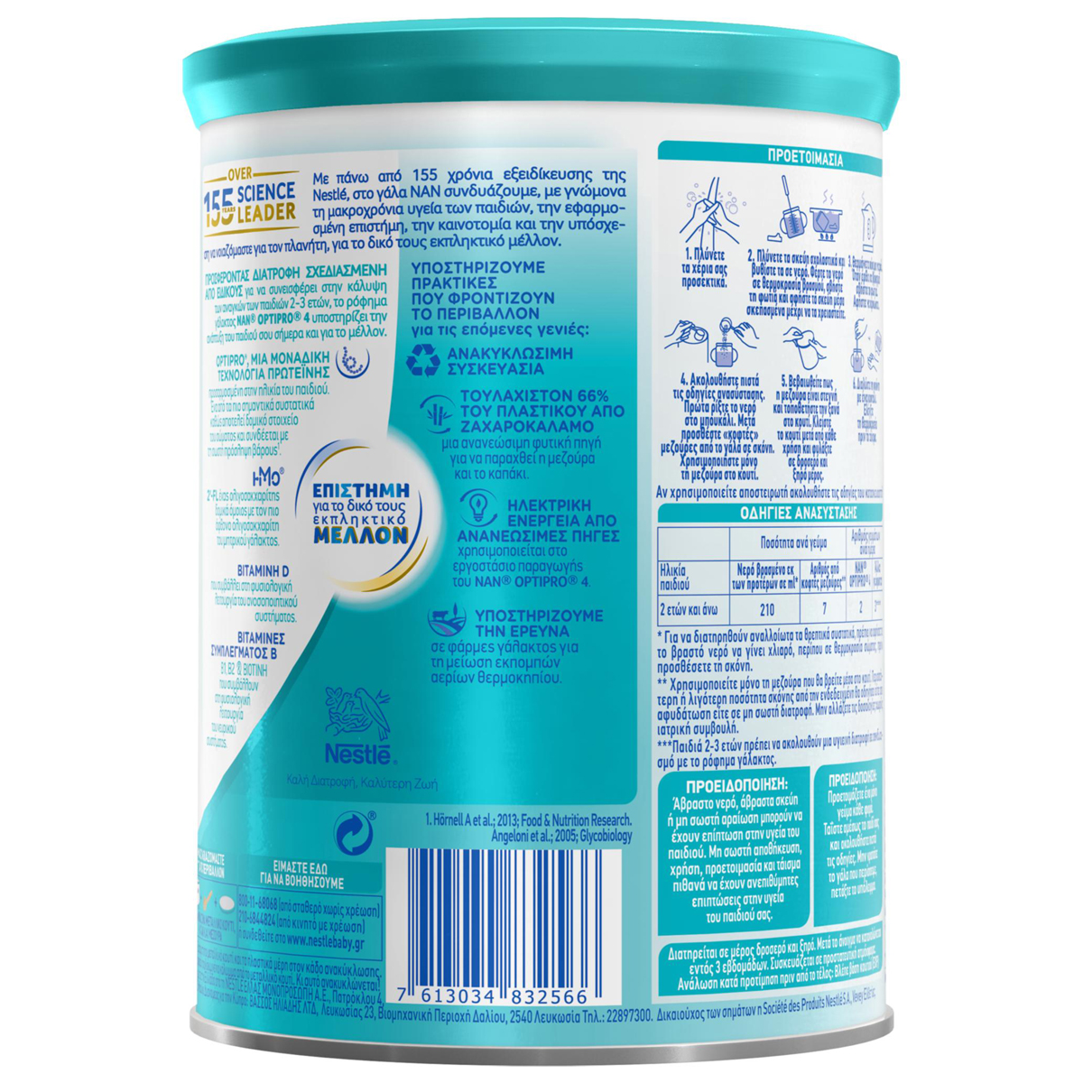 Milk powder drink from the second year. With over 155 years of Nestle expertise, in NAN milk we combine, with the long-term health of children in mind, applied science, innovation and a promise to care for the planet for their amazing future. BY PROVIDING NUTRITION DESIGNED BY SPECIALISTS to help meet the needs of 2-3 year olds, NAN® OPTIPRO® 4 milk drink supports your child's development today and for the future.