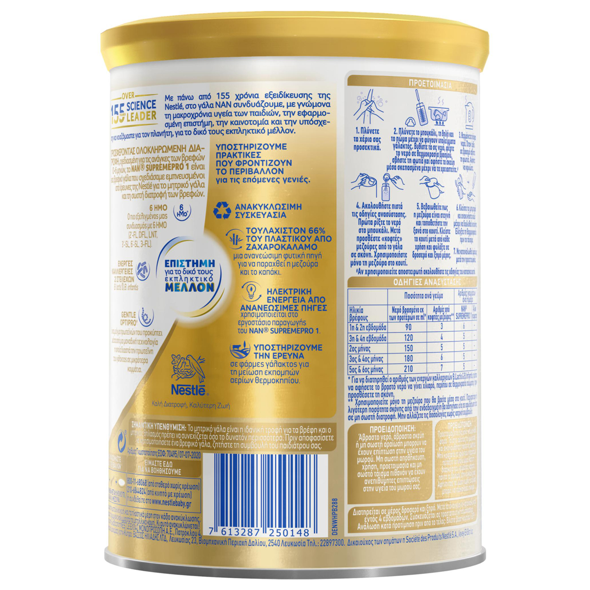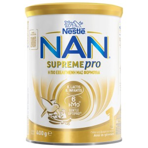 Milk for infants powder. From birth. With over 155 years of Nestle expertise, in NAN milk we combine, with the long-term health of children in mind, applied science, innovation and a promise to care for the planet for their amazing future. PROVIDING COMPLETE NUTRITION, designed for the needs of infants 0-6 months, NAN® SUPREMEPRO® 1 is an infant milk we designed inspired by Nestle's research on breast milk and proper infant nutrition.